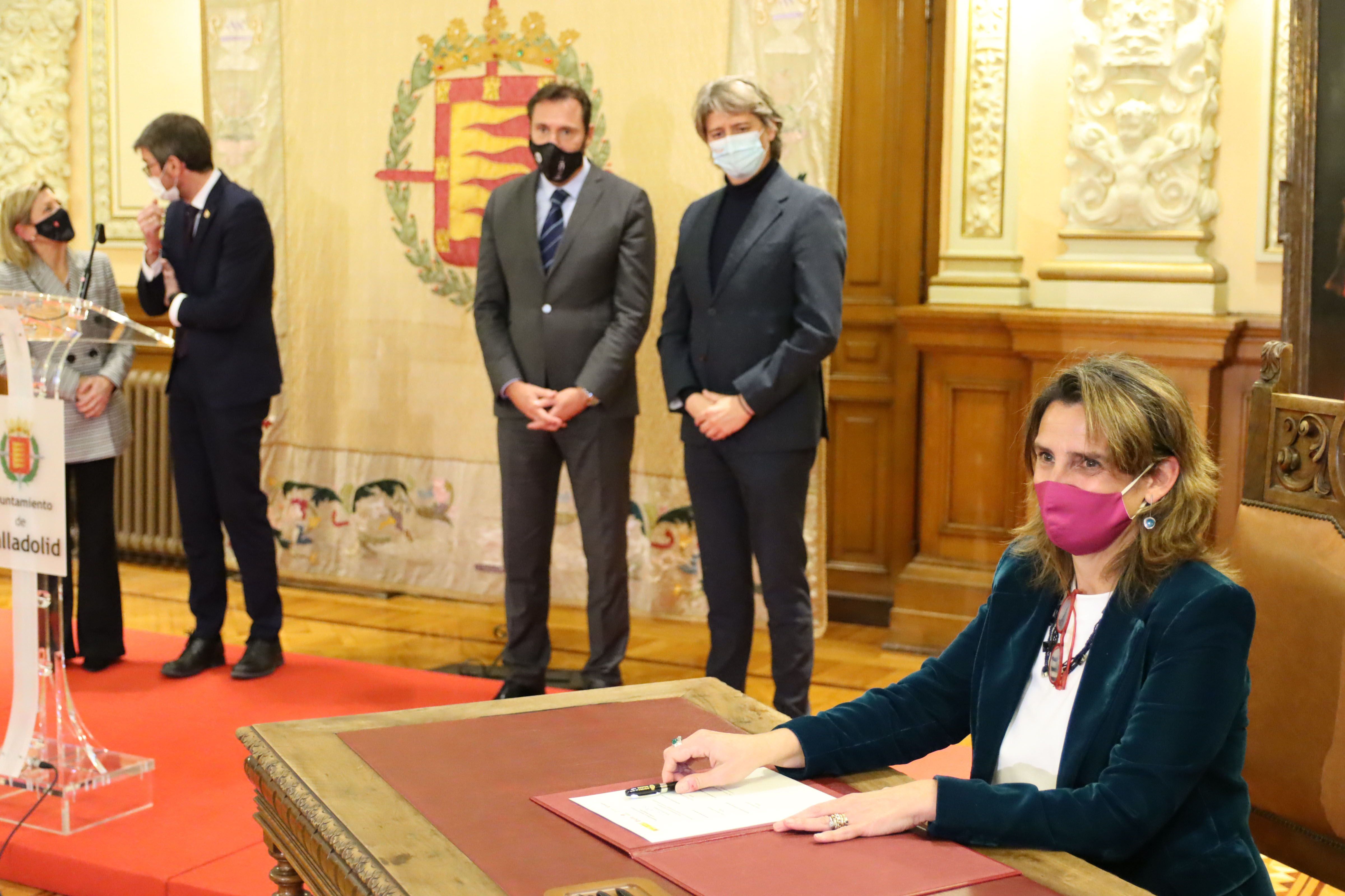 Madrid, Barcelona, Valencia, Sevilla y desde hoy Valladolid, Zaragoza, Soria y Vitoria-Gasteiz. Son las cuatro ciudades que se han adherido a la iniciativa europea que tiene como objetivo liderar la lucha contra el cambio climático con un horizonte muy definido: 2030. El documento se ha sellado en el Ayuntamiento de Valladolid con Teresa Ribera, vicepresidenta tercera y ministra para la Transición Ecológica y el Reto Demográfico, que ha animado a las ciudades españolas a liderar la transformación hacia la neutralidad climática y ser más sostenibles y habitables.