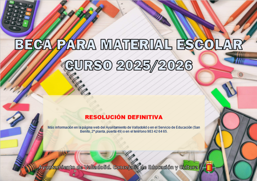 LISTADO CONCESIÓN DEFINITIVA DE LA BECA DE MATERIAL ESCOLAR PARA EL CURSO 2025/2026Por decreto firmado el 22 de diciembre de 2025 por la Concejala Delegada de Educación y Cultura, se ha resuelto la concesión definitiva de becas para material escolar destinado...