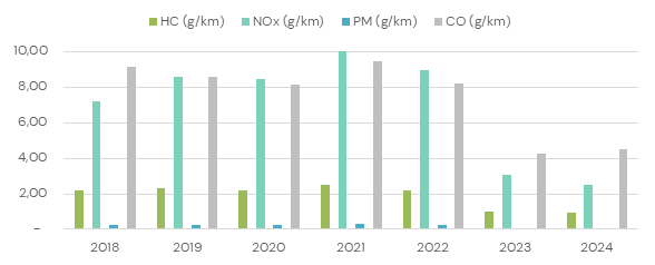 En estos dos últimos años las emisiones de óxidos de nitrógeno también disminuyen, en este caso de forma muy drástica de 8,9 gr/km a 2,5 gr/km. En el año 2024 las emisiones de óxidos de nitrógeno se reducen un 72%, las de partículas contaminantes se han reducido en un 69% y las de hidrocarburos un 56% respecto al año 2022.
