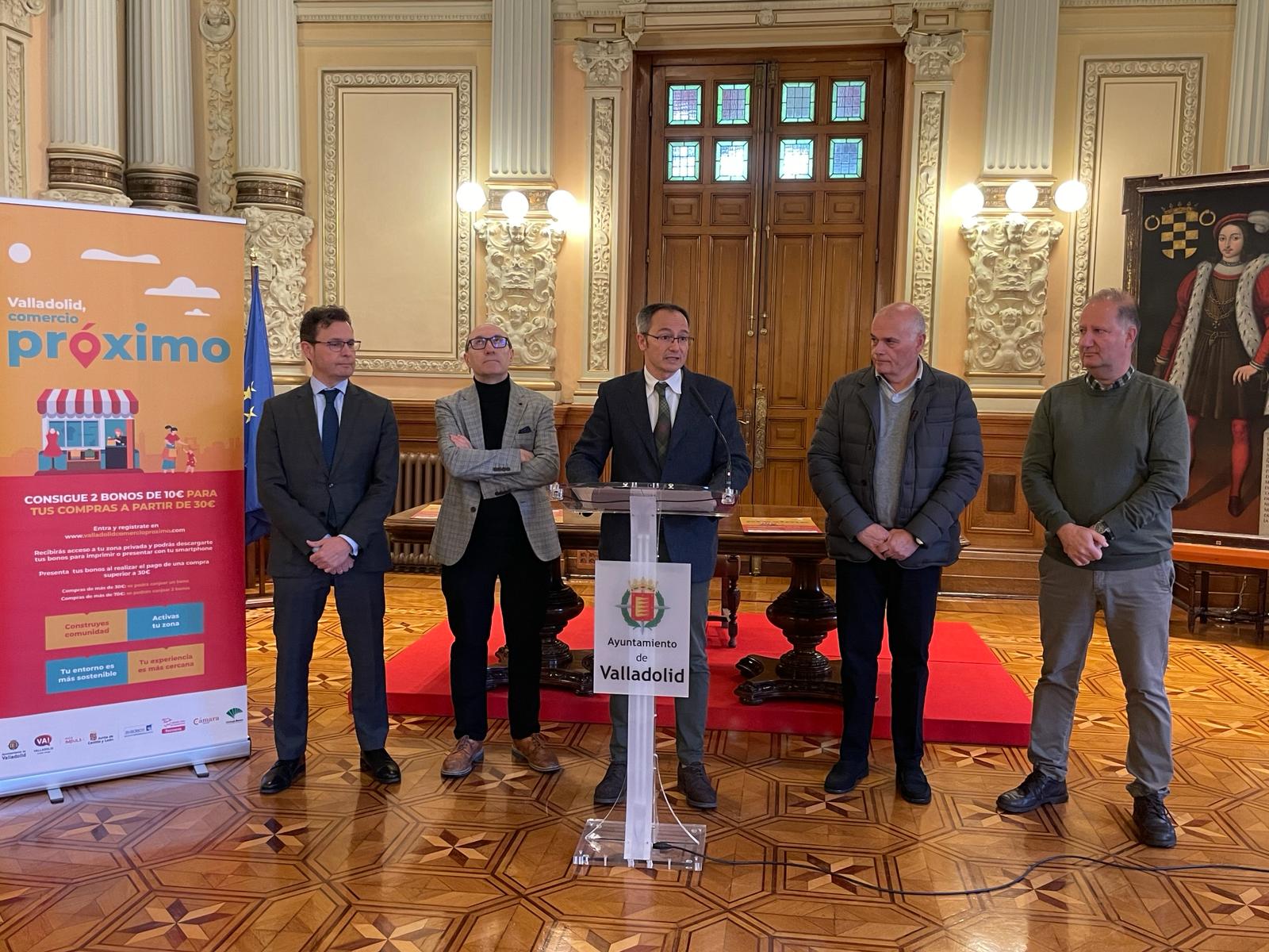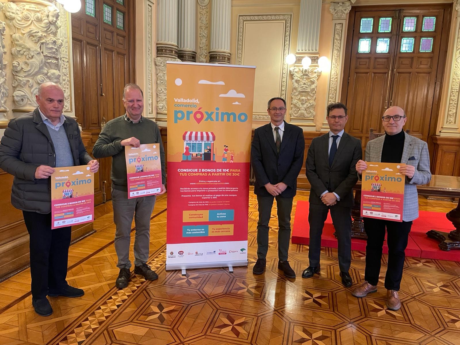 , en la que también se pueden consultar las bases generales de la campaña, así como la relación de los comercios participantes.El concejal de Comercio, Mercados y Consumo, Víctor Martín Meléndez; el presidente de AVADECO, Rafael Monedero Fernández; el presidente de FECOSVA, Jesús Herreras Revuelta; el vicepresidente de la Cámara de Comercio de Valladolid, Javier Labarga Vaca, y el director regional de Unicaja, José Manuel Motilla, han presentado hoy la campaña ‘Tu Bono Próximo-Primavera’, que se pondrá en marcha el próximo miércoles, 3 de abril, y se prolongará hasta el 8 de mayo, con el objetivo de apoyar y revitalizar las ventas en el pequeño comercio de Valladolid.