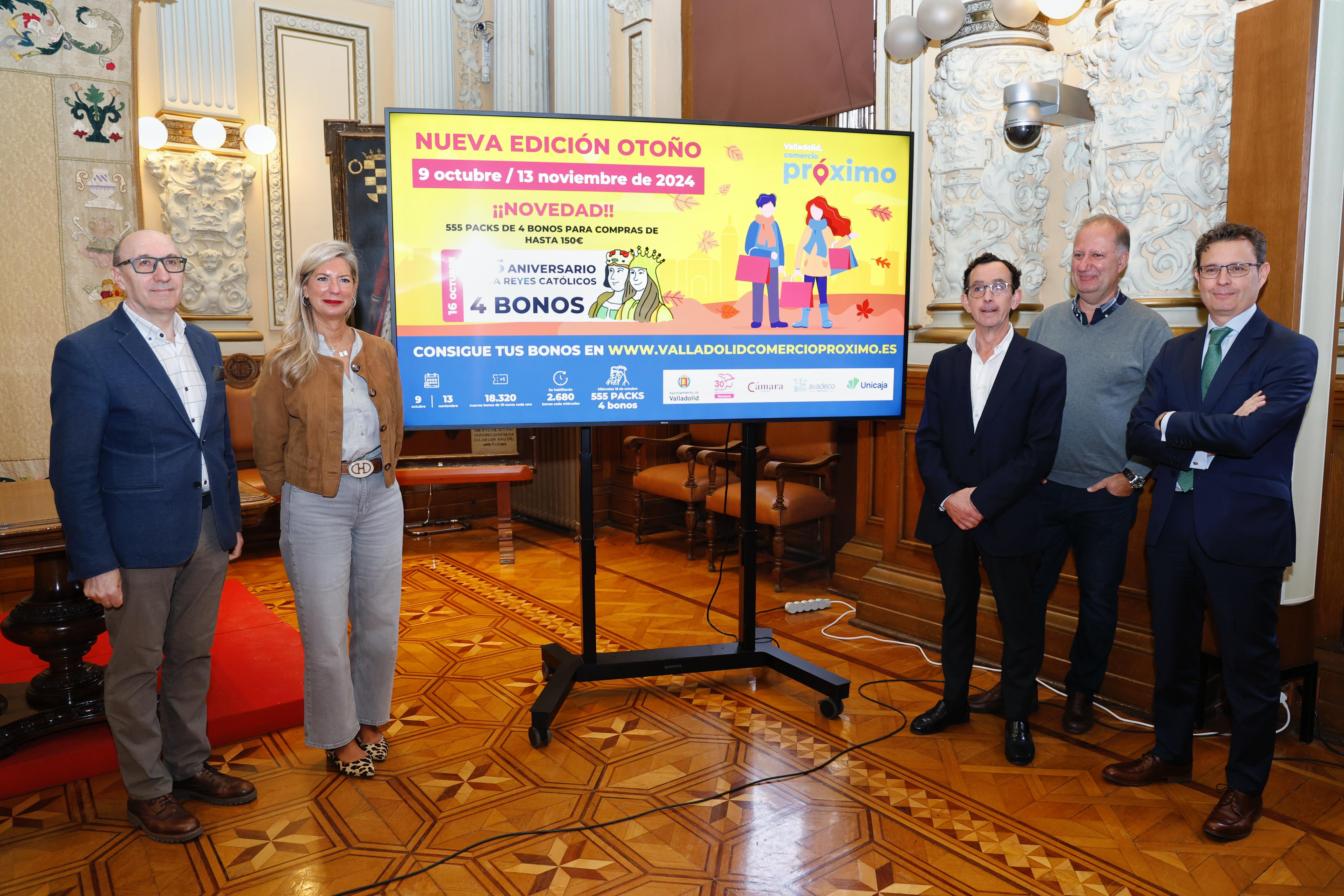 La concejala de Educación y Cultura, Irene Carvajal; el presidente de AVADECO, Rafael Monedero; el presidente de FECOSVA, Jesús Herreras; el tesorero de la Cámara de Comercio de Valladolid, Jorge Valentín-Gamazo; y el director de la Zona Valladolid Centro de Unicaja, José Manuel Matilla, han presentado en la mañana de hoy la campaña ‘Tu Bono Próximo – Otoño’ que se desarrollará desde mañana, 9 de octubre, hasta el 13 de noviembre, con el objetivo de apoyar y revitalizar las ventas en el pequeño comercio de la ciudad.