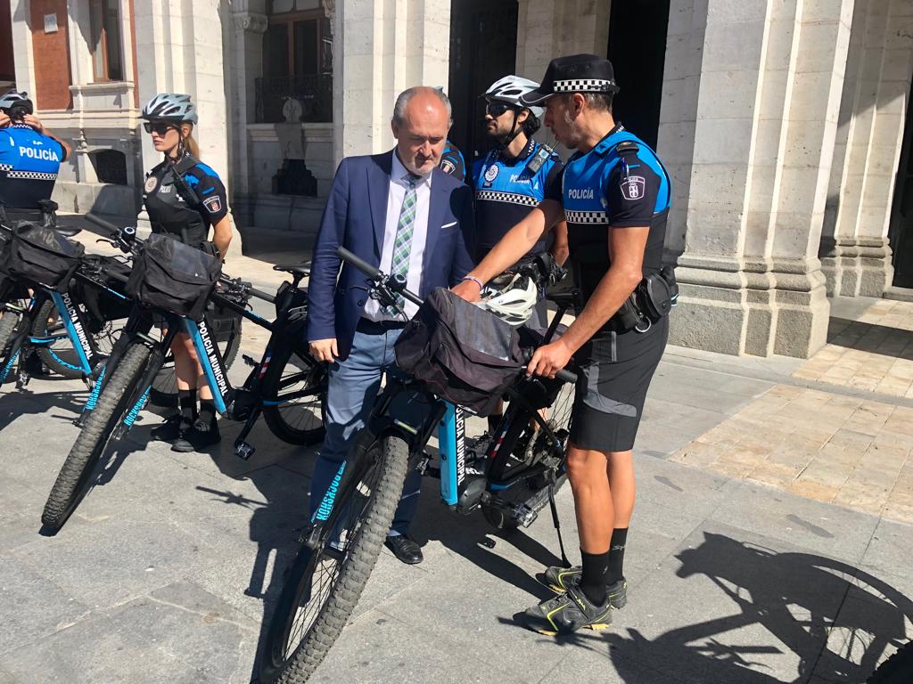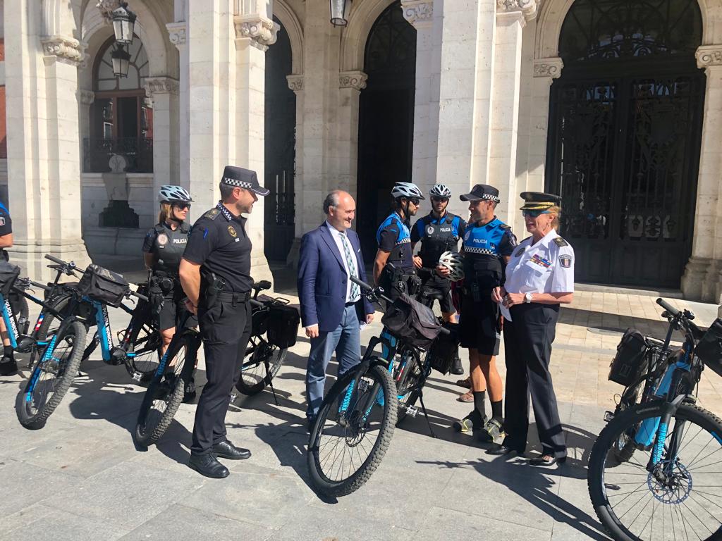 La Concejalía de Salud Pública y Seguridad Ciudadana del Ayuntamiento de Valladolid ha reactivado con motivo de la época estival la Sección Ciclista de la Policía Municipal. Así lo ha explicado su responsable, el concejal Alberto Cuadrado, durante la celebración de un acto que ha tenido lugar en la Plaza Mayor, con el fin de informar acerca de las características de esta Unidad que integran un total de diez policías -un oficial al mando y nueve agentes, siete hombres y dos mujeres-, quienes realizarán su servicio diario en bicicleta y patrullarán en binomios en los turnos de mañana y tarde, hasta el mes de octubre, en función de las condiciones climatológicas.