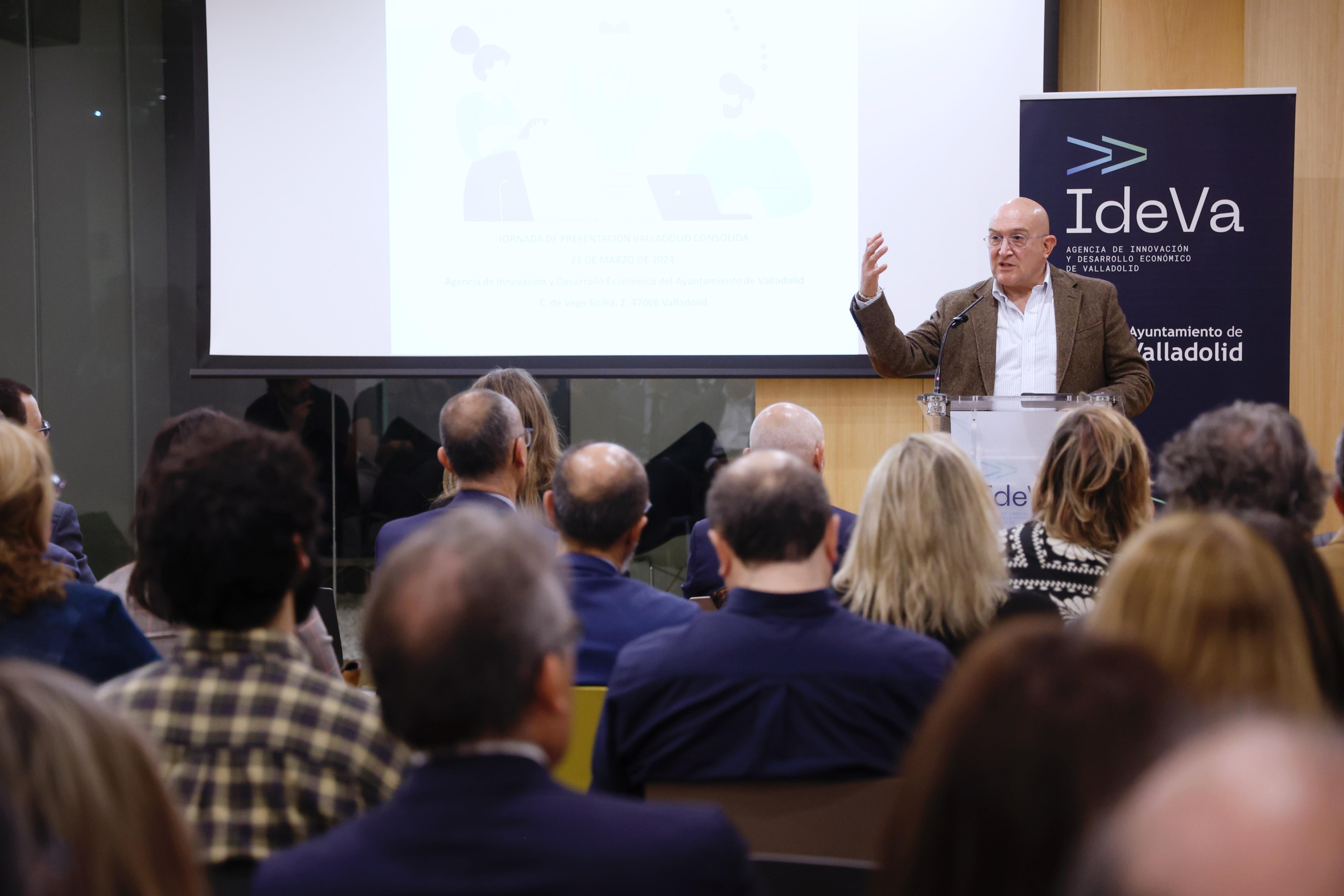 El alcalde de Valladolid, Jesús Julio Carnero, junto a Ángela de Miguel, presidenta de la Confederación Vallisoletana de Empresarios (CEOE Valladolid) y Víctor Caramanzana, presidente de la Cámara Oficial de Comercio, Industria y Servicios de Valladolid, han presentado el programa de la VI edición de ‘Valladolid Consolida’, en la Agencia de Innovación y Desarrollo Económico, en la jornada de arranque donde se han inscrito más de 80 participantes.
