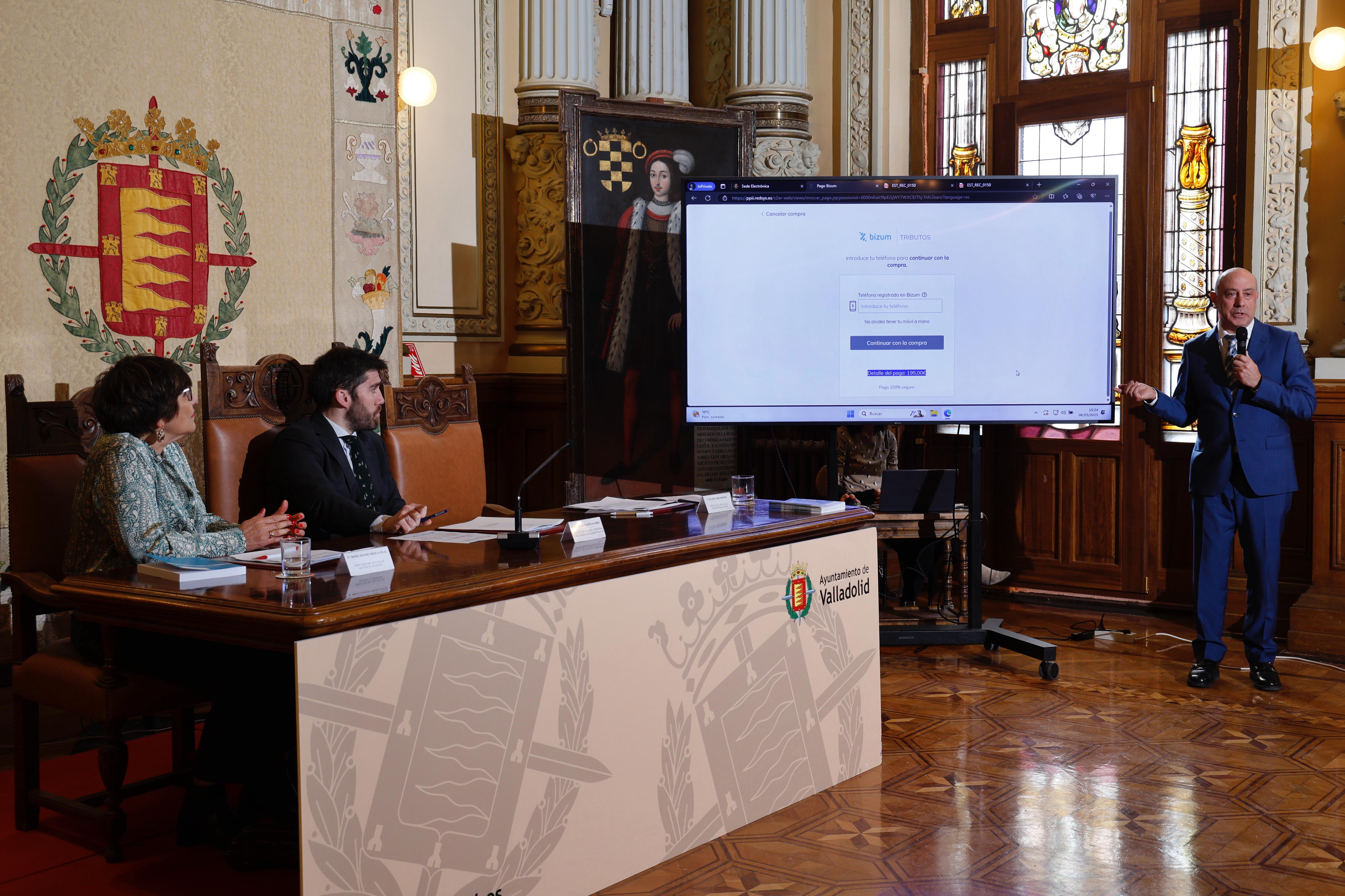 El concejal de Hacienda, Personal y Modernización Administrativa, Francisco Blanco, ha presentado hoy las modificaciones que el Ayuntamiento de Valladolid ha implementado en la nueva aplicación municipal de gestión de ingresos y recaudación, con el fin de renovar esta herramienta y facilitar así la relación tributaria con los ciudadanos. Durante la exposición, ha estado acompañado por Isolina Viñuela, jefa del Servicio de Gestión de Ingresos, y por Álvaro Sanz, jefe del Servicio de Gestión Recaudatoria.
