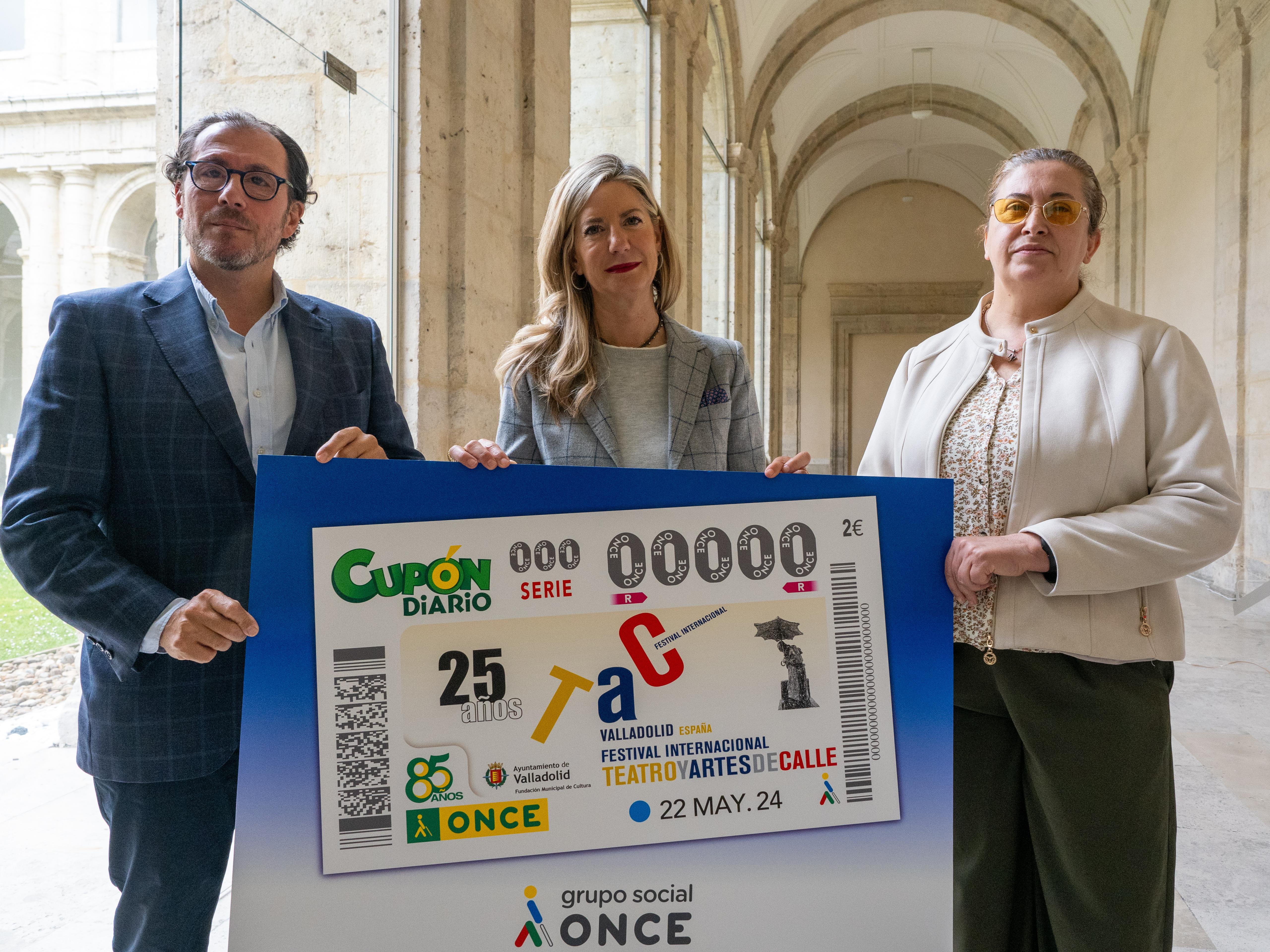 El 25 aniversario del Festival Internacional de Teatro y Artes de Calle de Valladolid-TAC es el protagonista del cupón de la ONCE del próximo miércoles, 22 de mayo, que hoy han presentado la concejala de Educación y Cultura del Ayuntamiento de Valladolid, Irene Carvajal, y el delegado ONCE en Castilla y León, Ismael Pérez, en un acto que ha tenido lugar en el Museo Patio Herreriano de Arte Contemporáneo y en el que han estado acompañados por la presidenta del Consejo Territorial ONCE en Castilla y León, Araceli de las Heras.