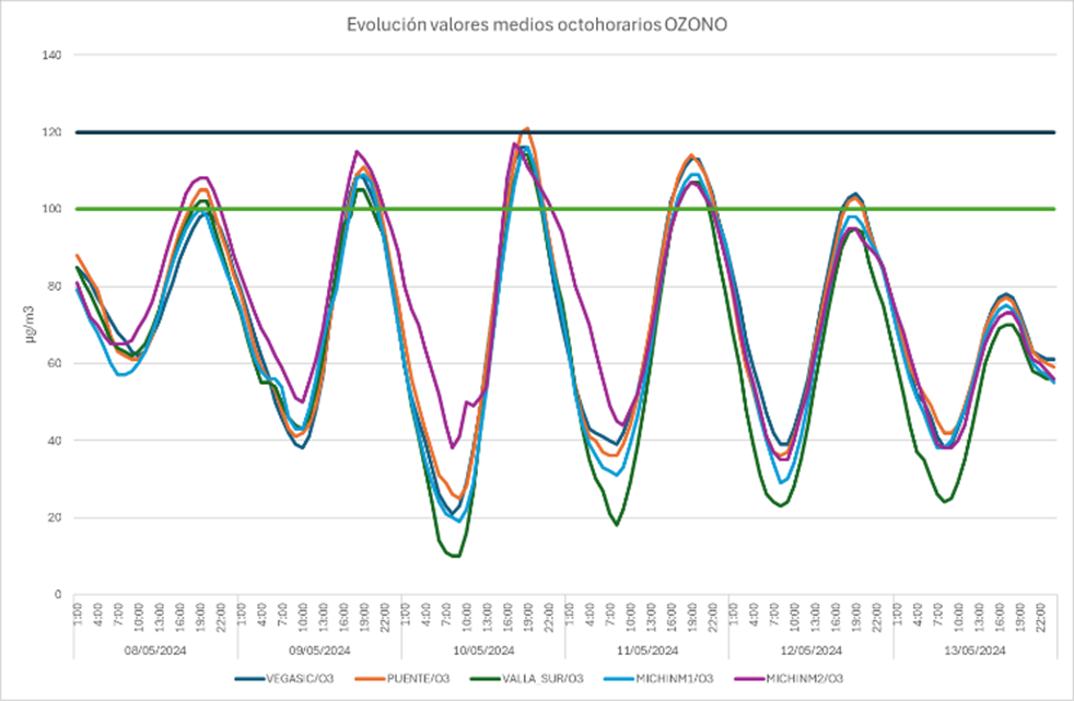En el siguiente gráfico se muestra la evolución de los valores octohorarios del episodio de contaminación por ozono.