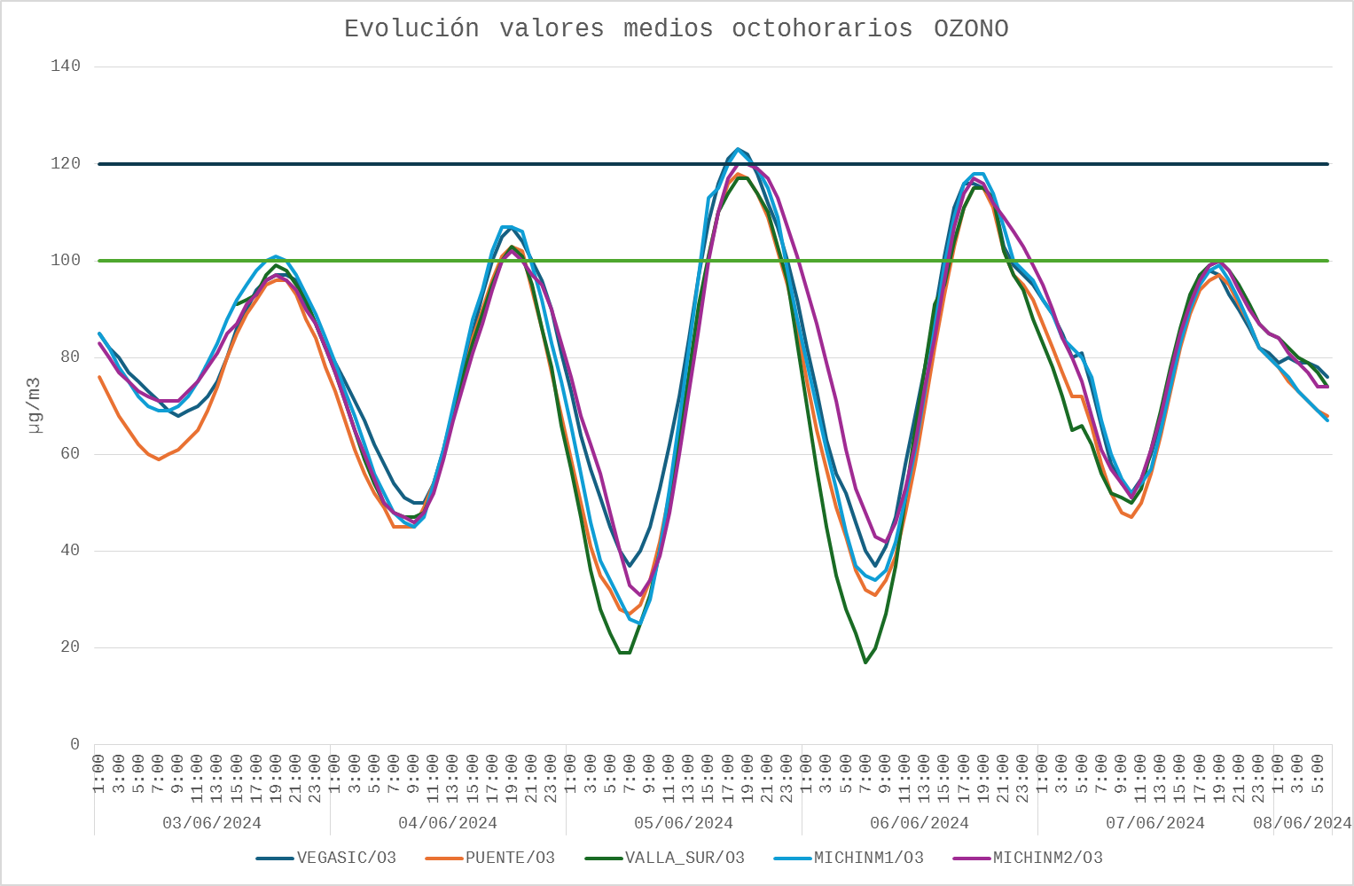 En el siguiente gráfico se muestra la evolución de los valores octohorarios del episodio de contaminación por ozono.