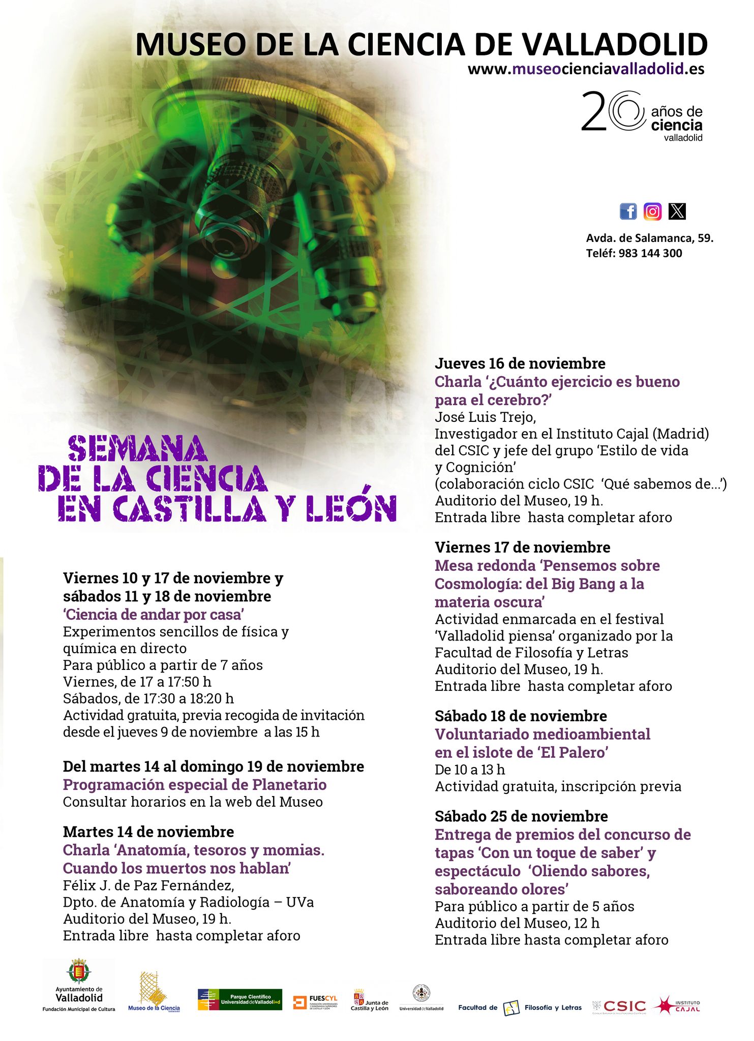 Por su parte, el Auditorio del Museo acogerá dos interesantes charlas de entrada gratuita: el martes 14 de noviembre, a las 19:00 horas, ‘Anatomía, tesoros y momias. Cuando los muertos nos hablan’, a cargo de Félix J. de Paz Fernández, profesor titular de Anatomía y Embriología Humanas de la Facultad de Medicina de la Universidad de Valladolid (UVa); y el jueves 16 de noviembre, a las 19:00 horas, ‘¿Cuánto ejercicio es bueno para el cerebro?’, de José Luis Trejo, Investigador en el Instituto Cajal (Madrid) del CSIC y jefe del grupo ‘Estilo de Vida y Cognición’.