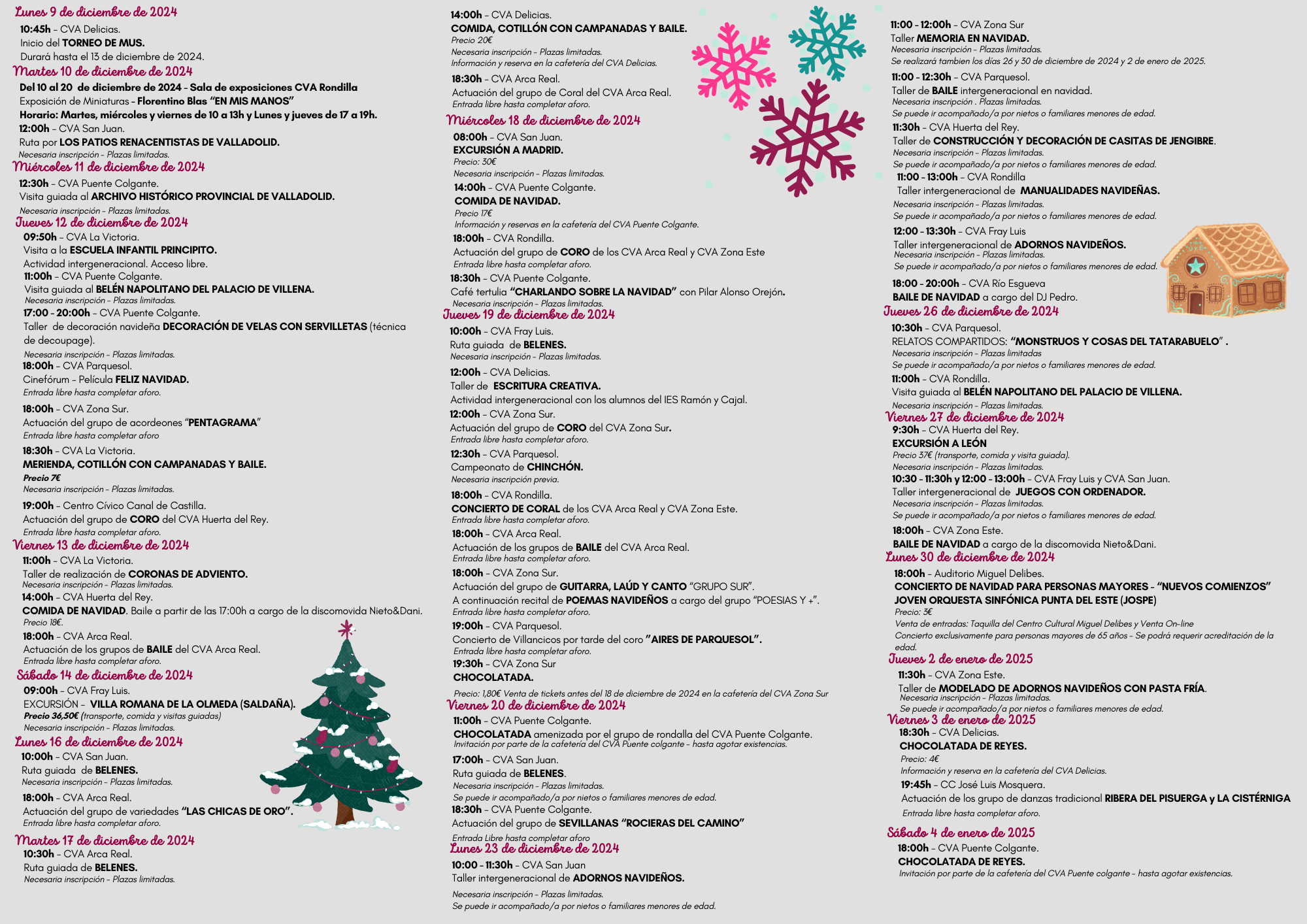 • Actuaciones culturales y musicales. Coros, grupos de baile y teatro llenarán los Centros de Vida Activa de música y arte, destacando conciertos de villancicos y actuaciones de grupos locales.
