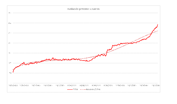 Destaca el importante crecimiento experimentado desde mediados de diciembre hasta la fecha donde se ha pasado de 200 usuarios a prácticamente 300, esto supone un incremento del 50% en dos meses.