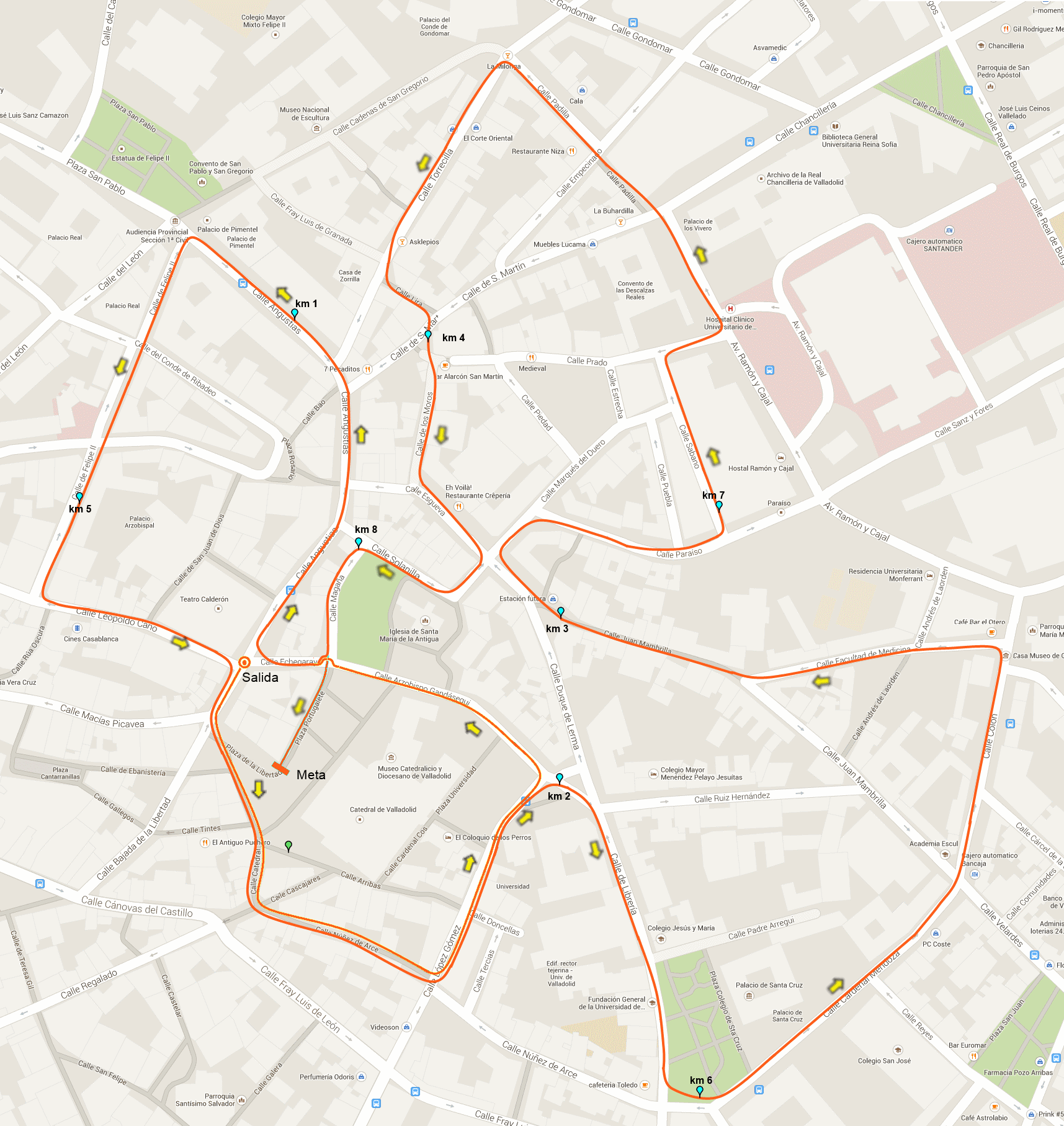 La carrera presenta un recorrido de 8,2 kilómetros en tres vueltas (dos largas y una corta) con pasos delante de algunos de los edificios más emblemáticos del casco histórico de Valladolid, como el Teatro Calderón, la Universidad de Valladolid, el palacio de Santa Cruz, la calle Juan Mambrilla, las iglesias de Angustias, San Martín y La Antigua y el lateral de la Catedral.