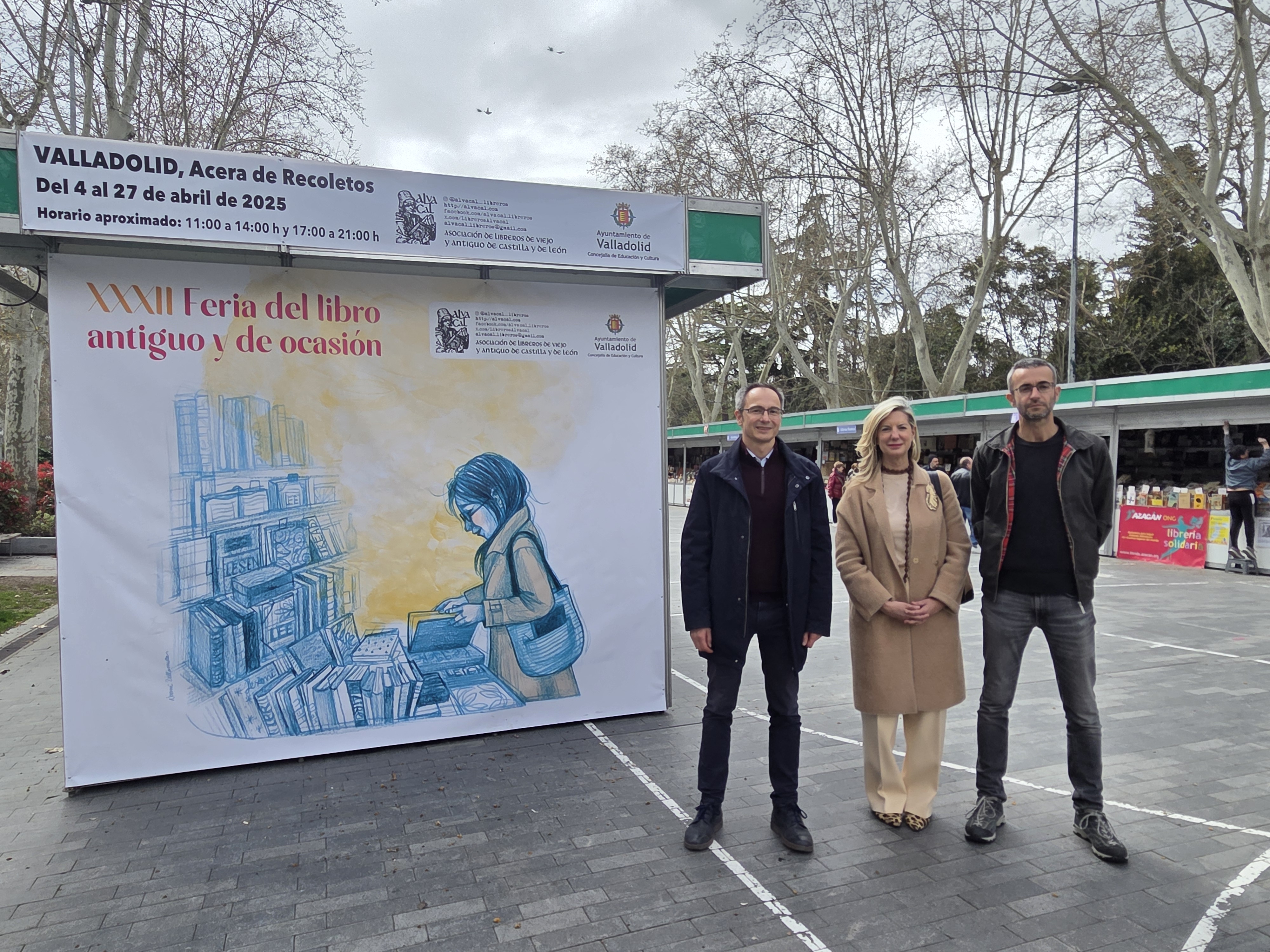 La concejala de Educación y Cultura, Irene Carvajal, ha inaugurado esta mañana en la Acera de Recoletos la 32 Feria del Libro Antiguo y de Ocasión de Valladolid, que un año más se consolida como uno de los eventos culturales de más tradición de la ciudad y estará presente en su habitual ubicación, la Acera de Recoletos, para ofrecer un fondo de más de 100.000 libros de lo más variado, desde rarezas antiguas y primeras ediciones dedicadas hasta libros de ocasión e infantiles. Uno de esos libros, precisamente, es el que está hojeando la protagonista del cartel de este año, una ilustración realizada por la reconocida ilustradora palentina Noemí Villamuza.