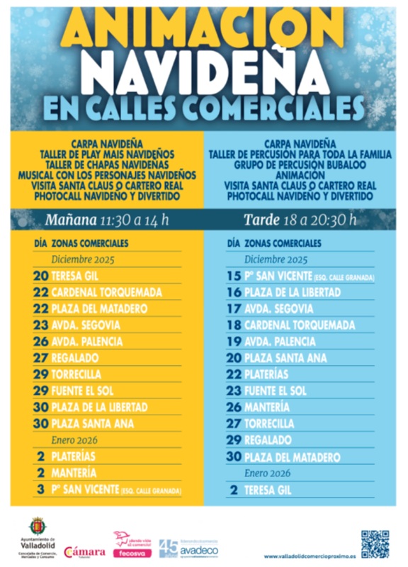 Tendrán lugar entre el 15 de diciembre de 2025 y 4 de enero 2026, tanto en el centro como en diversos barrios de la ciudad. La programación puede consultarse en la página web www.valladolidcomercioproximo.esThis link will open in a pop-up window..
