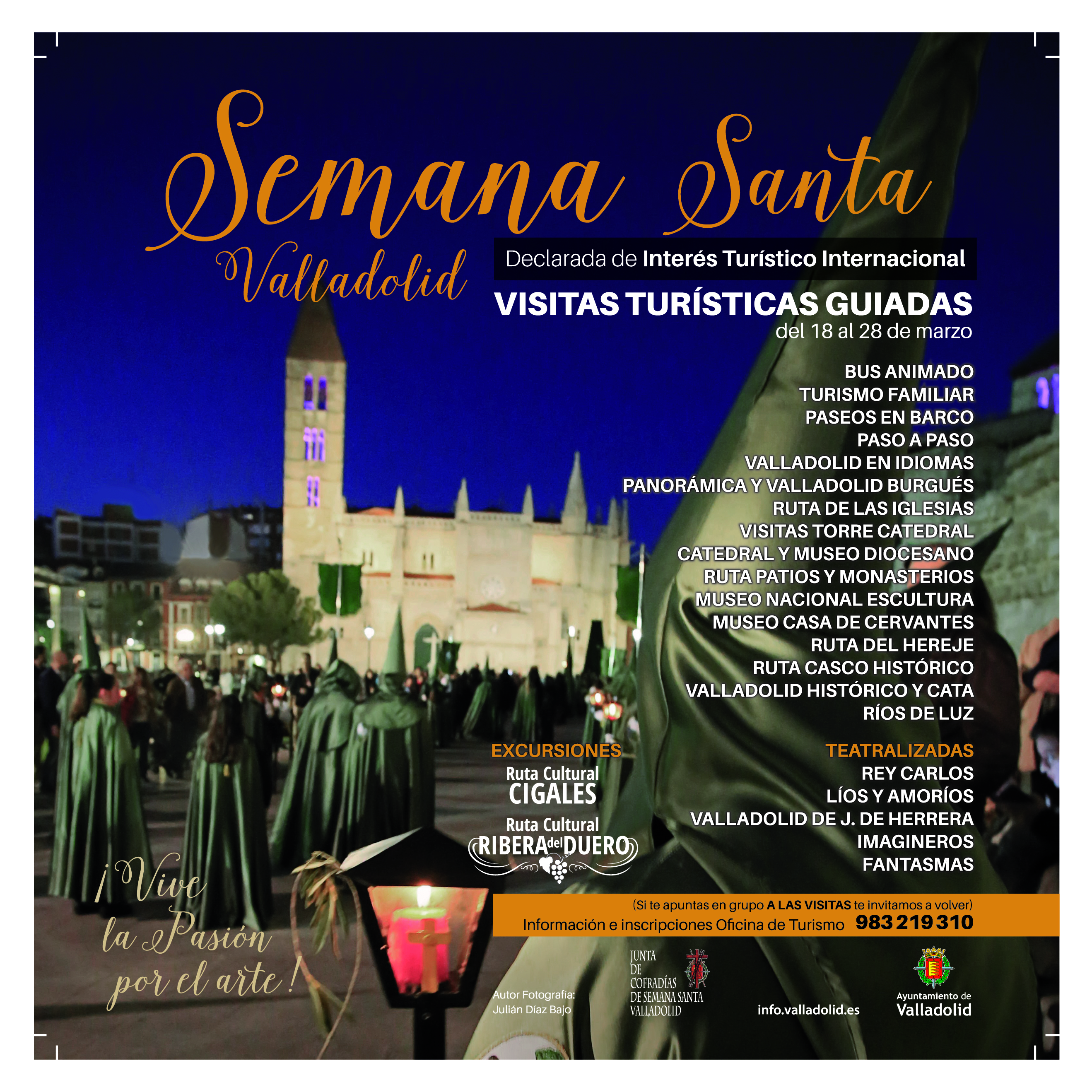 El Ayuntamiento de Valladolid, a través de la Sociedad Mixta para la Promoción del Turismo ha organizado, del 18 al 28 de marzo, un amplio programa de visitas turísticas guiadas que incluye dos rutas culturales: una por las tierras de la Ribera de Duero -19 de marzo- y otra por las tierras de Cigales -26 de marzo-; además, de la oferta habitual de bus y barco turísticos y subida a la torre de la catedral