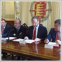 El consejero de Fomento y Medio Ambiente, Antonio Silván, los alcaldes de Valladolid, Arroyo de la Encomienda y Simancas, Javier León de la Riva, José Manuel Méndez Freijo y Miguel Rodríguez –respectivamente-, han presentado esta mañana en la Casa Consistorial los convenios necesarios para avanzar en la mejor prestación de servicios a sus habitantes.