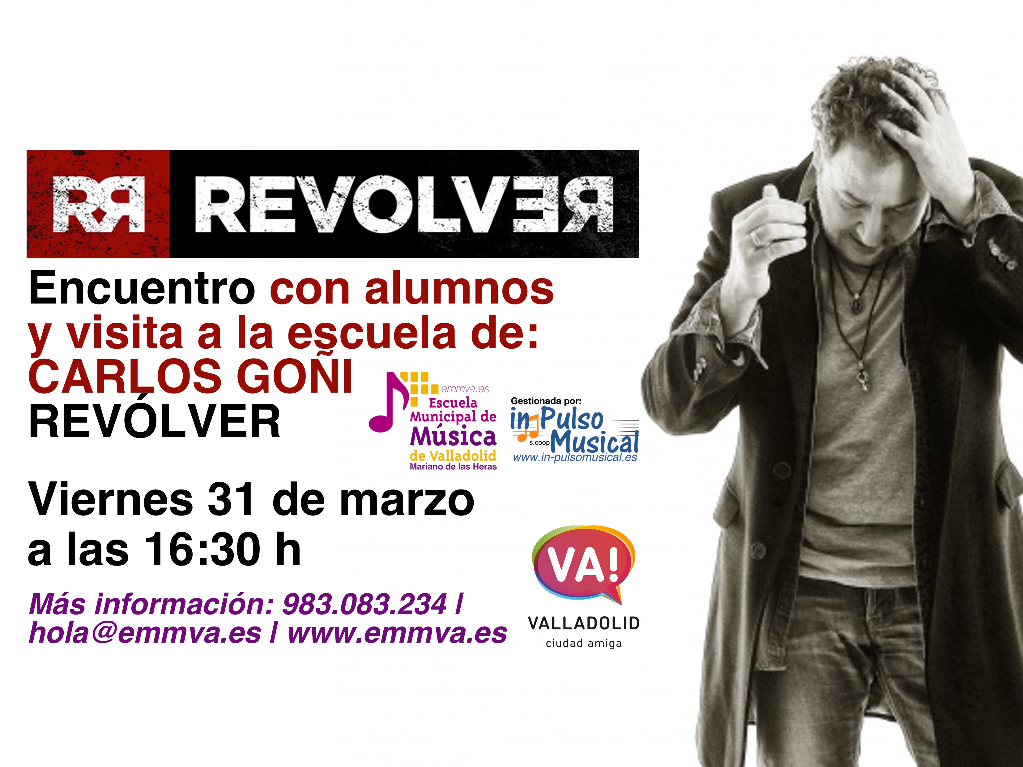 La Escuela Municipal de Música "Mariano de las Heras" del Ayuntamiento de Valladolid recibirá, el próximo 31 de marzo, la visita de Carlos Goñi, el líder de ‘Revólver’, aprovechando su visita a Valladolid con motivo del concierto que ofrecerá en el Teatro Carrión.- Fecha de la noticia