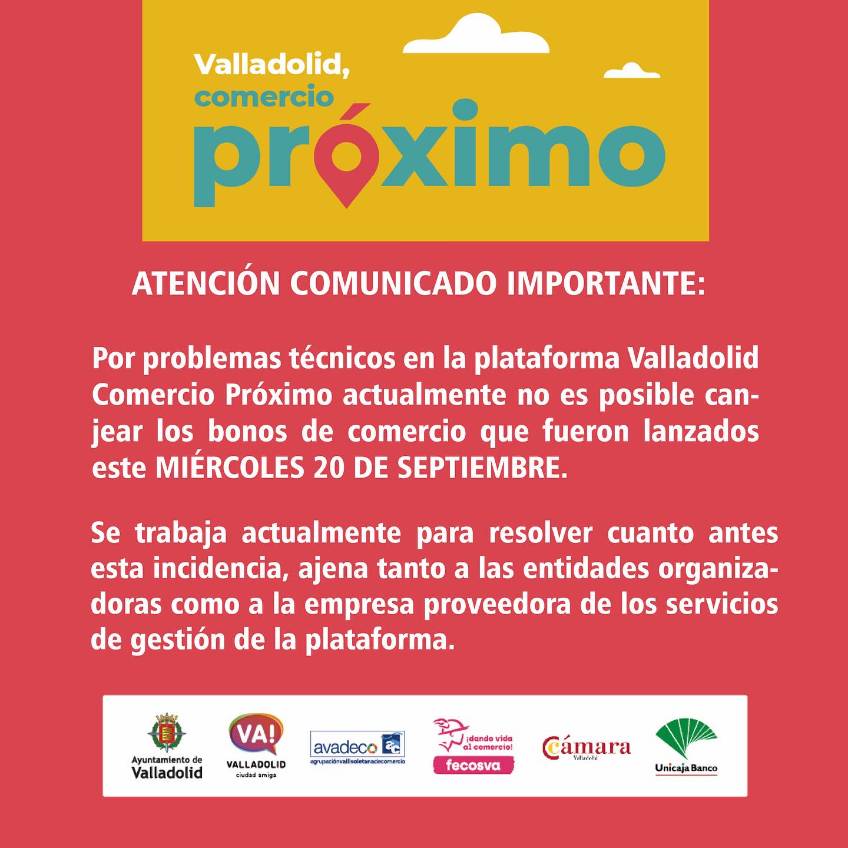 Por problemas técnicos en la plataforma Valladolid Comercio Próximo actualmente no es posible canjear los bonos de comercio que fueron lanzados este miércoles 20 de septiembre.Las entidades que integran la Mesa del Comercio: Ayuntamiento de Valladolid, Cámara...
