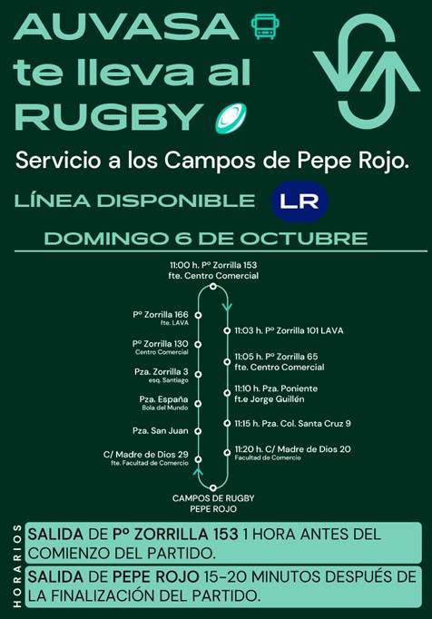 La empresa municipal de transporte ha diseñado una línea lanzadera que saldrá desde paseo de Zorrilla, frente a Vallsur, una hora antes del partido, y regresará de Pepe Rojo al término del mismo.Los aficionados al rugby en la ciudad de Valladolid van a poder...
