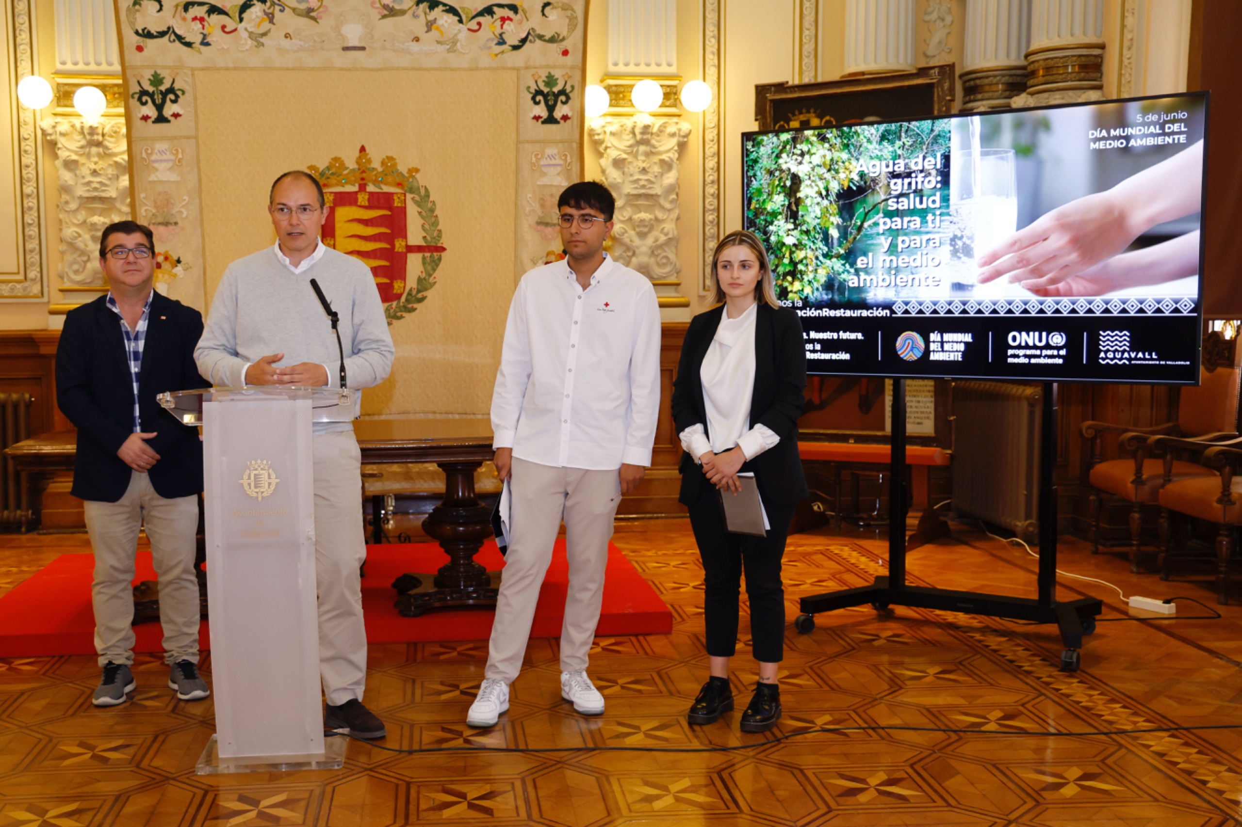 El concejal de Medio Ambiente y presidente del Consejo de Administración de Aquavall, Alejandro García Pellitero, ha presentado hoy las actividades organizadas por Aquavall para conmemorar el Día Mundial del Medio Ambiente dirigidas a la sensibilización de la sociedad. Ha estado acompañado por el presidente de Cruz Roja Valladolid, Juan José Zancada; el director de Cruz Roja Juventud, Pablo Santamaría, y la presidenta del Consejo Local de la Juventud, Mónica Salcedo. En el acto también ha estado presente la concejala de Juventud, Carolina del Bosque.