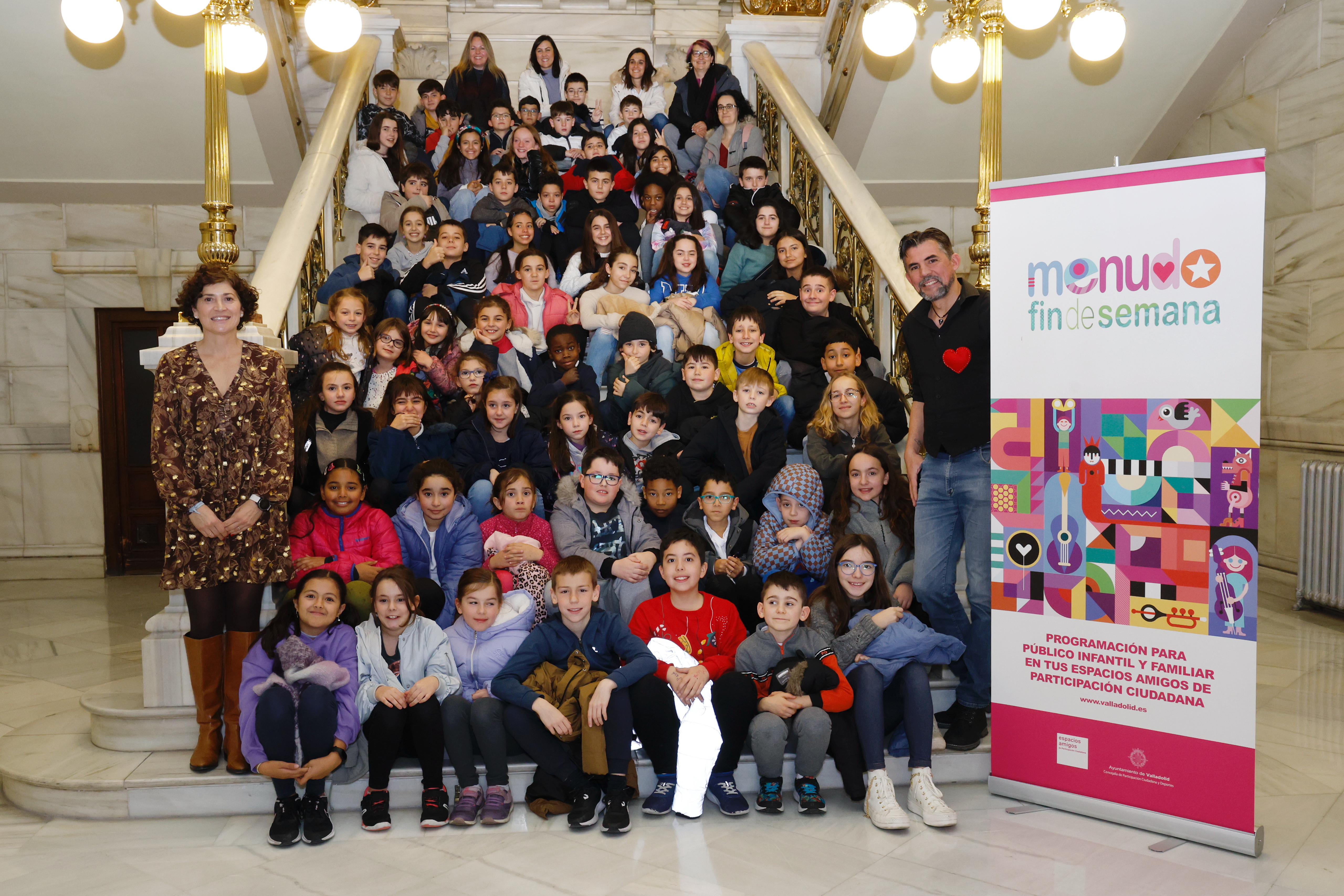La concejala de Participación Ciudadana y Deportes, Mayte Martínez, ha presentado hoy en el Ayuntamiento la programación correspondiente a la primera de las dos ediciones que conformarán en 2024 el programa ‘Menudo fin de semana’, y que estará compuesta por un total de 35 actuaciones que se desarrollarán entre los meses de febrero y mayo. La segunda de las ediciones se celebrará a partir de octubre. Al acto han asistido alumnos de 3º a 6º de Educación Primaria, del CEIP Isabel la Católica.