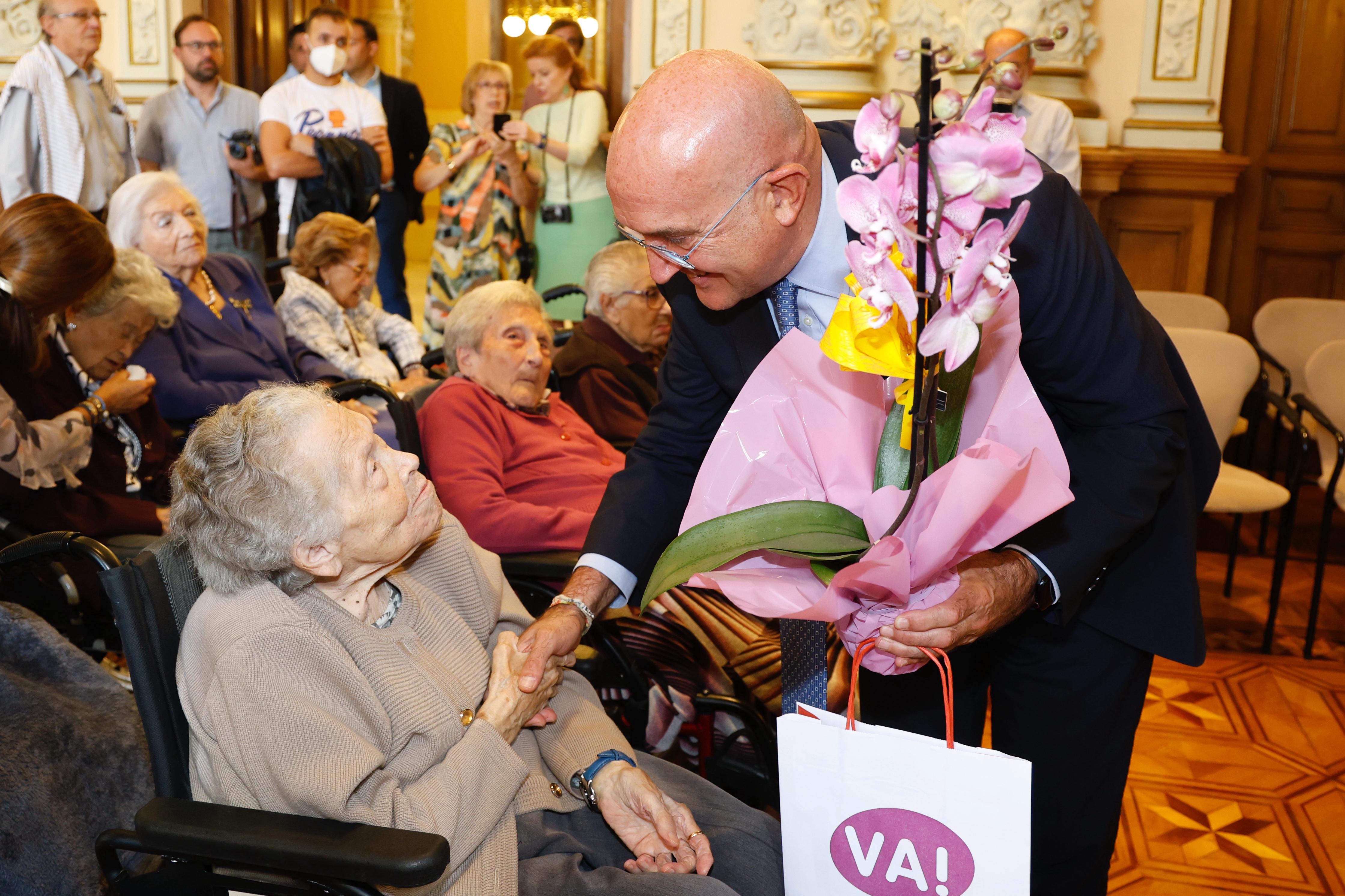 El alcalde de Valladolid, Jesús Julio Carnero, ha recibido hoy, junto al concejal de Personas Mayores, Familia y Servicios Sociales, Rodrigo Nieto, y la concejala de Juventud, Carolina del Bosque, a 28 personas centenarias y a sus familiares, en la conmemoración del Día Internacional de las Personas de Edad que se celebraba el pasado domingo día 1.