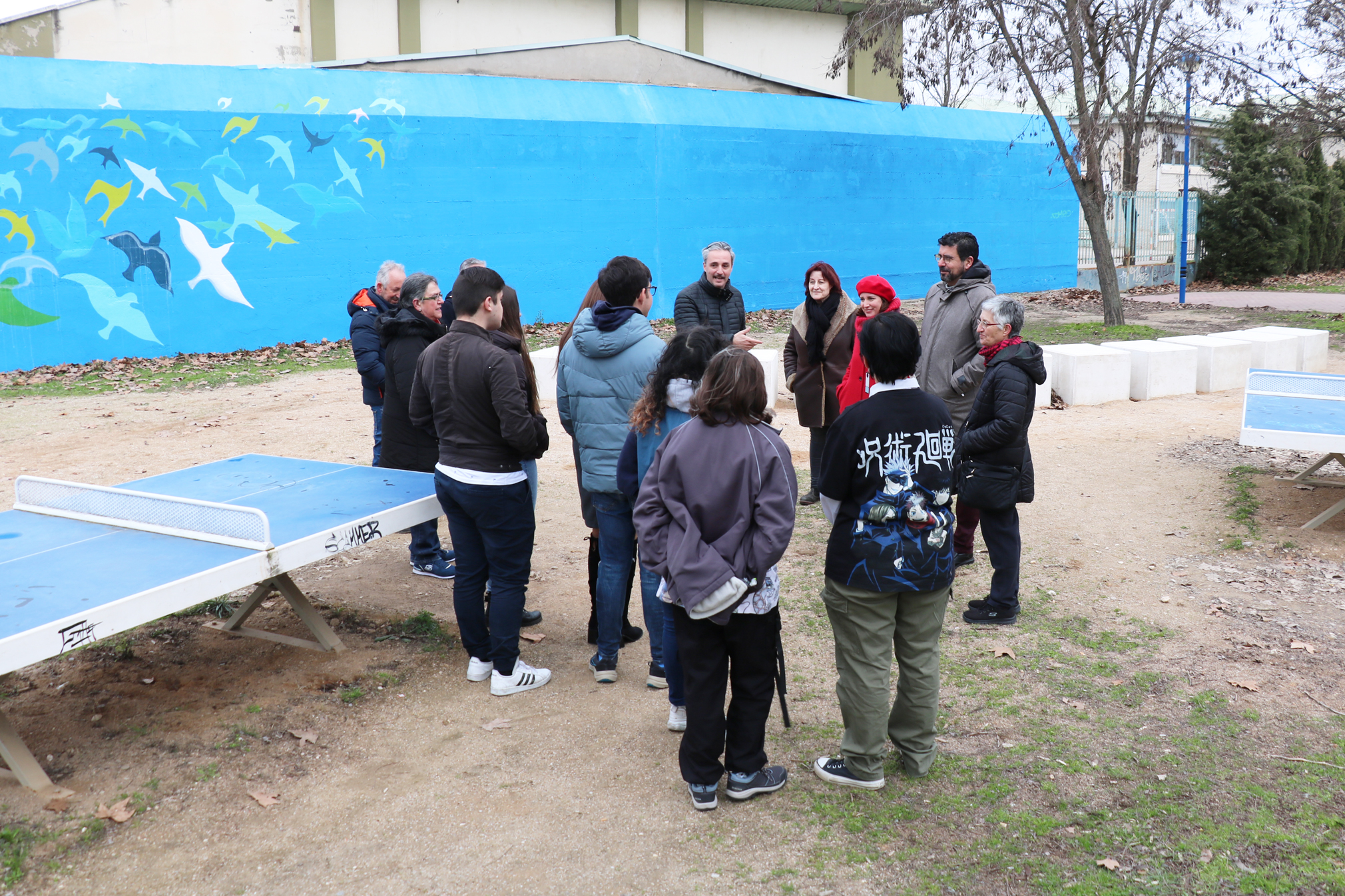 2. Ágora Pajarillos (Propuesta alumnos IES Galileo: espacio de intercambio). La zona de actuación se encuentra tras el IES Galileo y las instalaciones deportivas de Don Bosco, limitando con la calle de la Reja. Se ha realizado el revestimiento del muro con pintura al cemento y pintado de forma colaborativa por jóvenes de la zona. Además, se han colocado bancos para facilitar un espacio de encuentro.