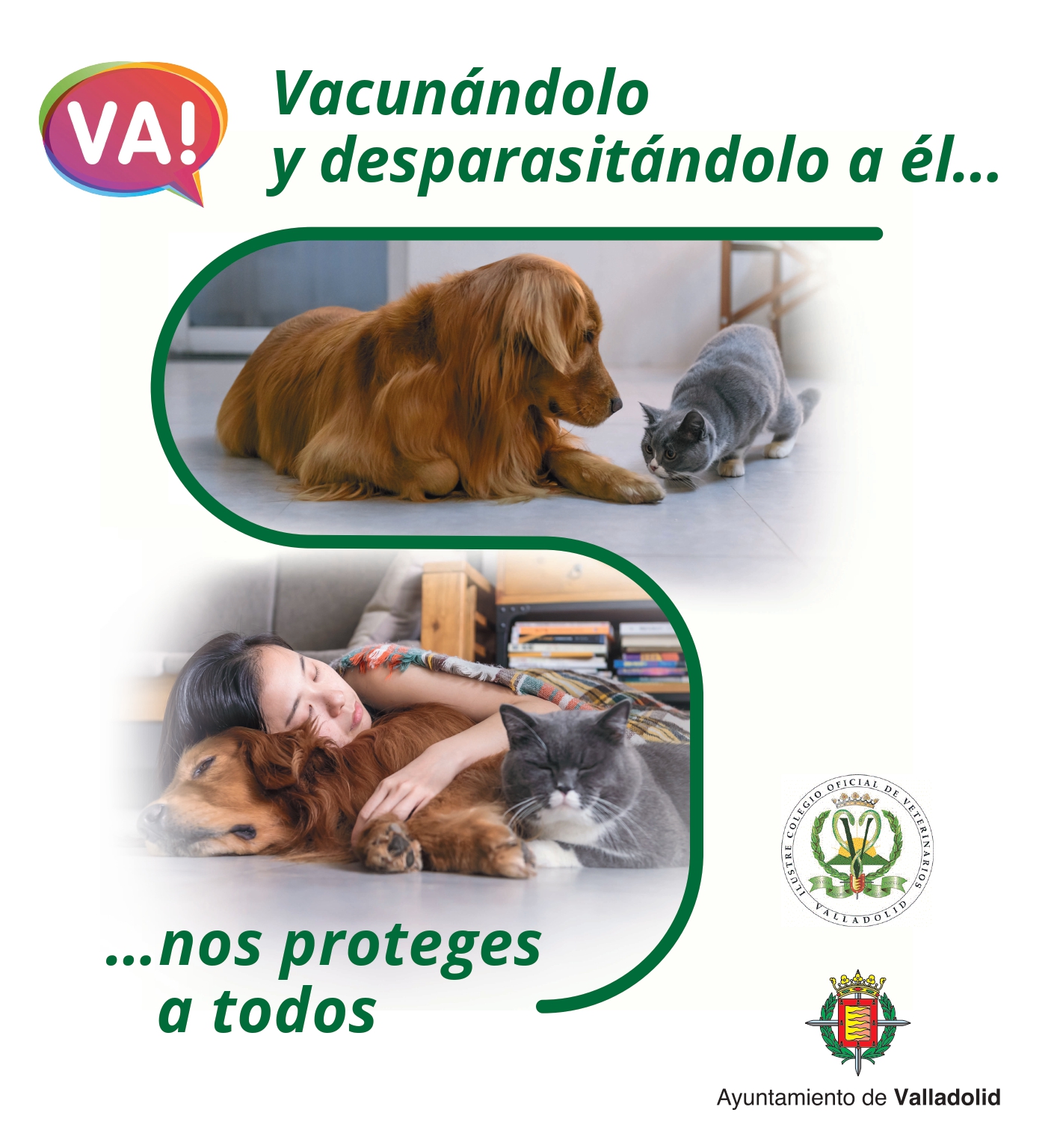 "Vacunando a tu mascota evitarás que contraiga enfermedades. Mantendrás a tu familia protegida frente a posibles zoonosis. El profesional veterinario es el único que puede asesorarte sobre el plan preventivo que mejor se adapte a cada animal". Son los mensajes que se incluyen en la campaña que lanzan conjuntamente el Ayuntamiento de Valladolid y el Colegio de Veterinarios. Por eso han editado un díptico sobre los programas sanitarios adaptados a cada mascota, esenciales desde la perspectiva de salud pública. Se trata de concienciara los propietarios de los animales de compañía sobre la importancia de mantener al día sus programas sanitarios de vacunación y desparasitación, aspecto fundamental para la salud de la mascota y para evitar que trasmita enfermedades a la personas.