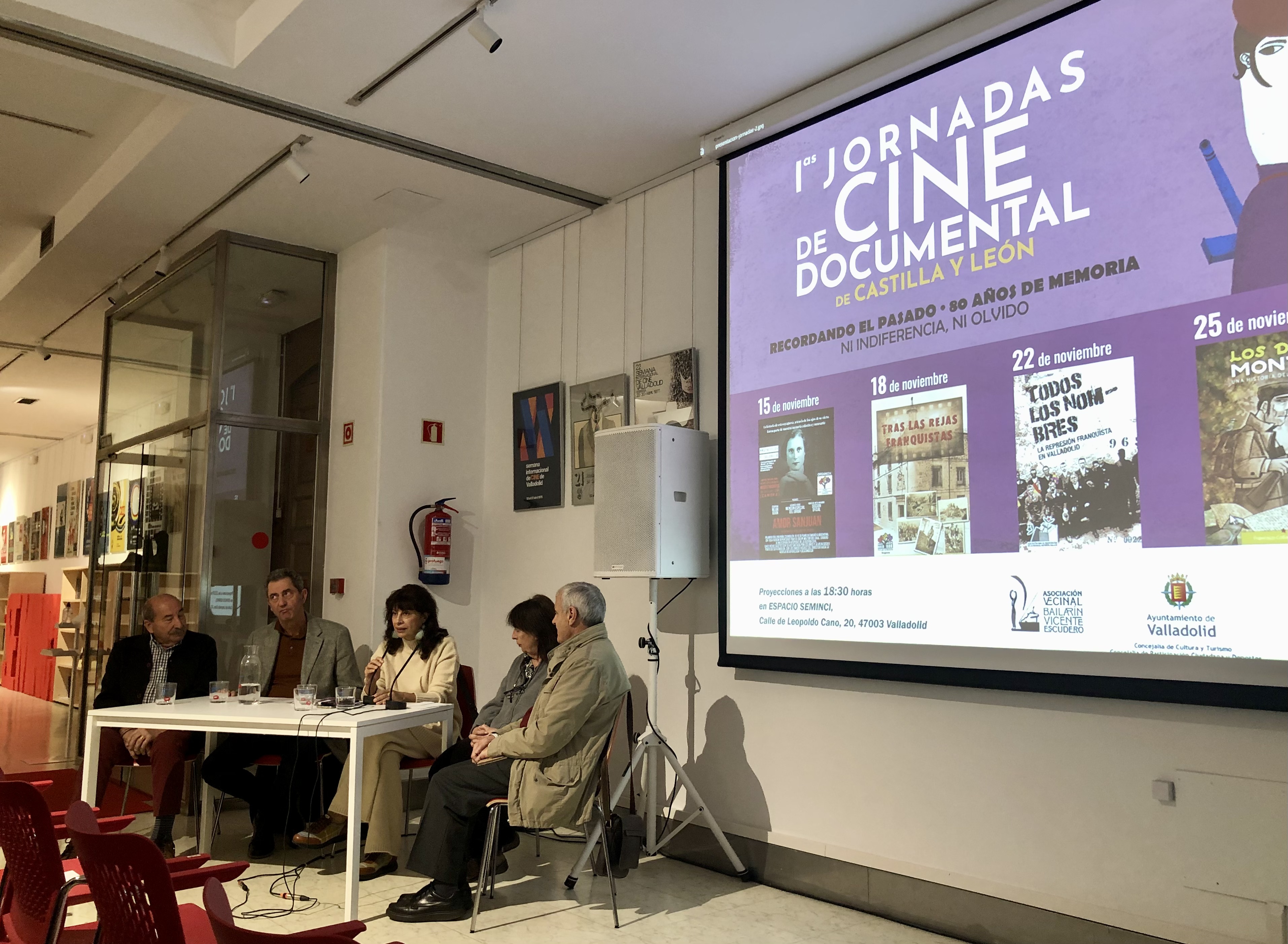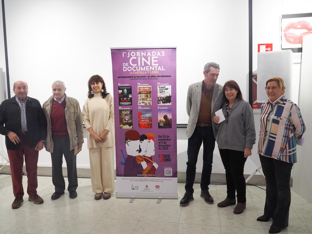 El Espacio Seminci ha acogido la presentación de las Primeras Jornadas de Cine Documental de Castilla y León sobre la Memoria Democrática con la asistencia de la concejala de Cultura y Turismo, Ana Redondo; el senador por Valladolid Manuel Escarda; Orosia Castán Lanaspa, Emiliano Bahabon y el presidente de la Asociación Vecinal Bailarín Vicente Escudero, Jesús Valverde.