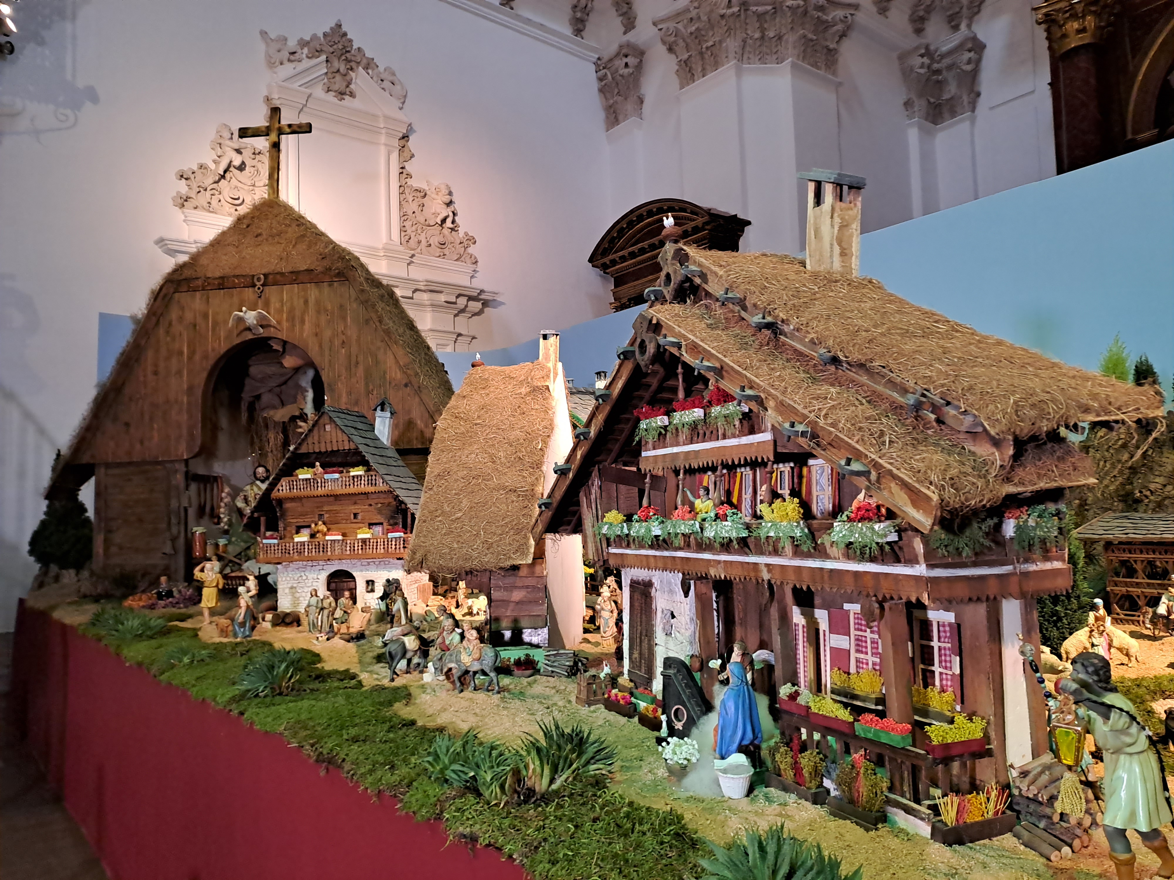 Los edificios, de hasta 90 centímetros de altura, han sido realizados con madera de pino de forma totalmente artesanal y sometidos a procesos de envejecimiento para dotarlos de mayor realismo. De mayor tamaño es el granero que supera los dos metros de altura y da cobijo a un Misterio del siglo XVII, con una talla de la Virgen María de más de 80 centímetros y un San José de casi un metro, y una corona del siglo XIV, la pieza más antigua de todas las expuestas.