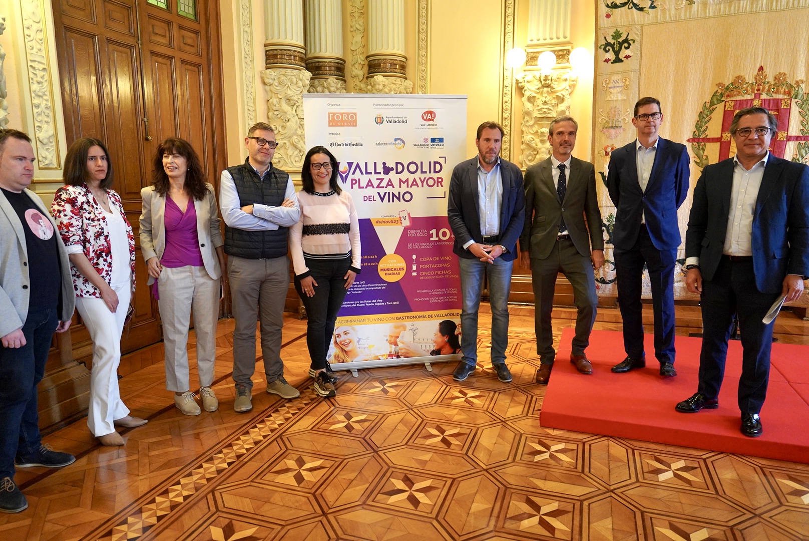 El alcalde de Valladolid, Óscar Puente; la concejala de Cultura y Turismo, Ana Redondo; el delegado de Foro de Debate en Castilla y León, Manuel Salgado; y el director general de El Norte de Castilla, Goyo Ezama; han presentado la V edición de Plaza Mayor del Vino, que tendrá lugar en la Plaza Mayor de Valladolid los días 5, 6 y 7 de mayo.
