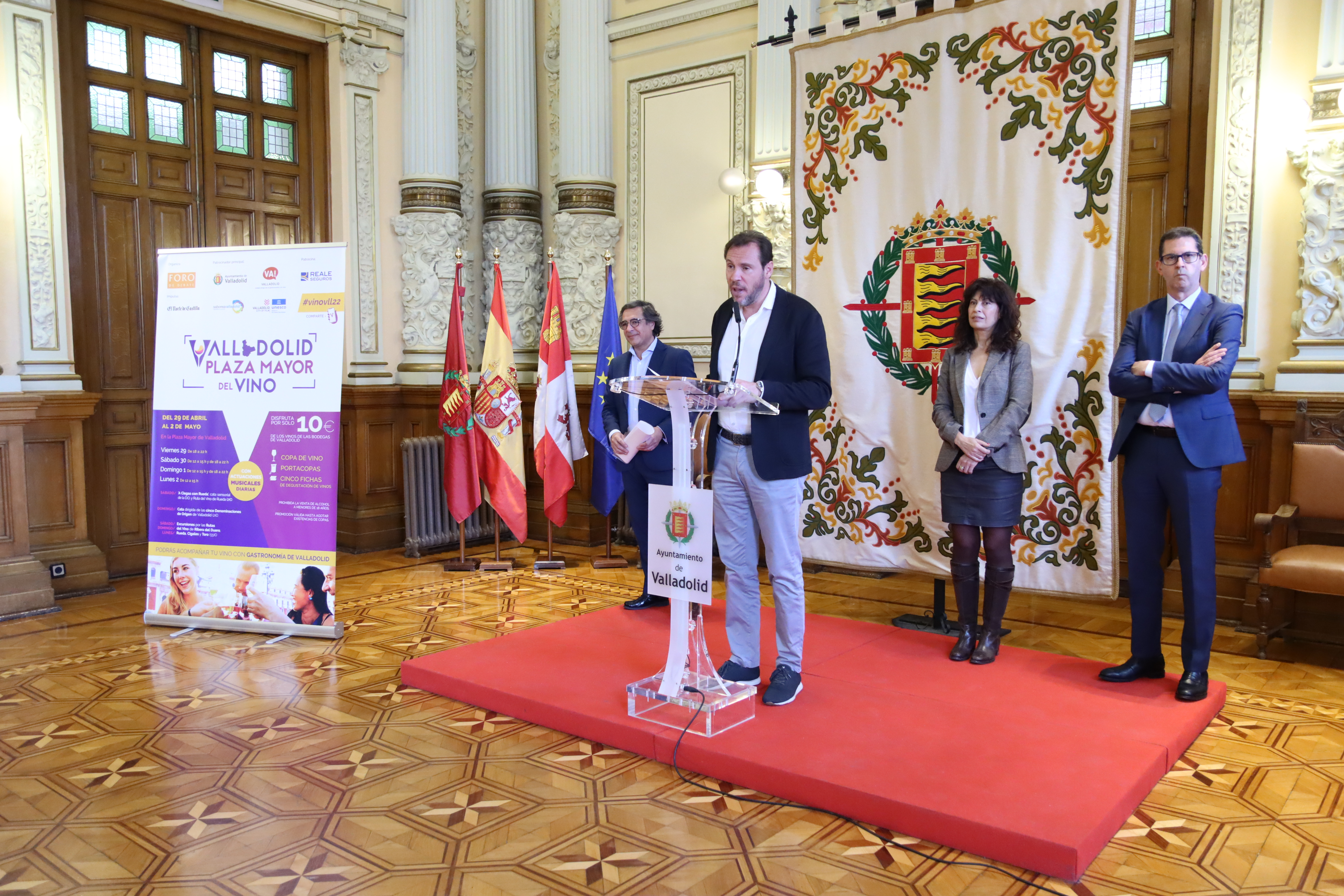 El alcalde de Valladolid, Óscar Puente; la concejala de Cultura y Turismo, Ana Redondo; el director general de El Norte de Castilla, Goyo Ezama y Manuel Salgado, delegado de Foro Debate en Castilla y León; han presentado la cuarta edición de "Valladolid. Plaza Mayor del Vino", que se celebrará del 29 de abril al 2 de mayo. Durante esos días, la Plaza Mayor se convierte en punto de encuentro de las cinco denominaciones de origen con presencia en la provincia de Valladolid.