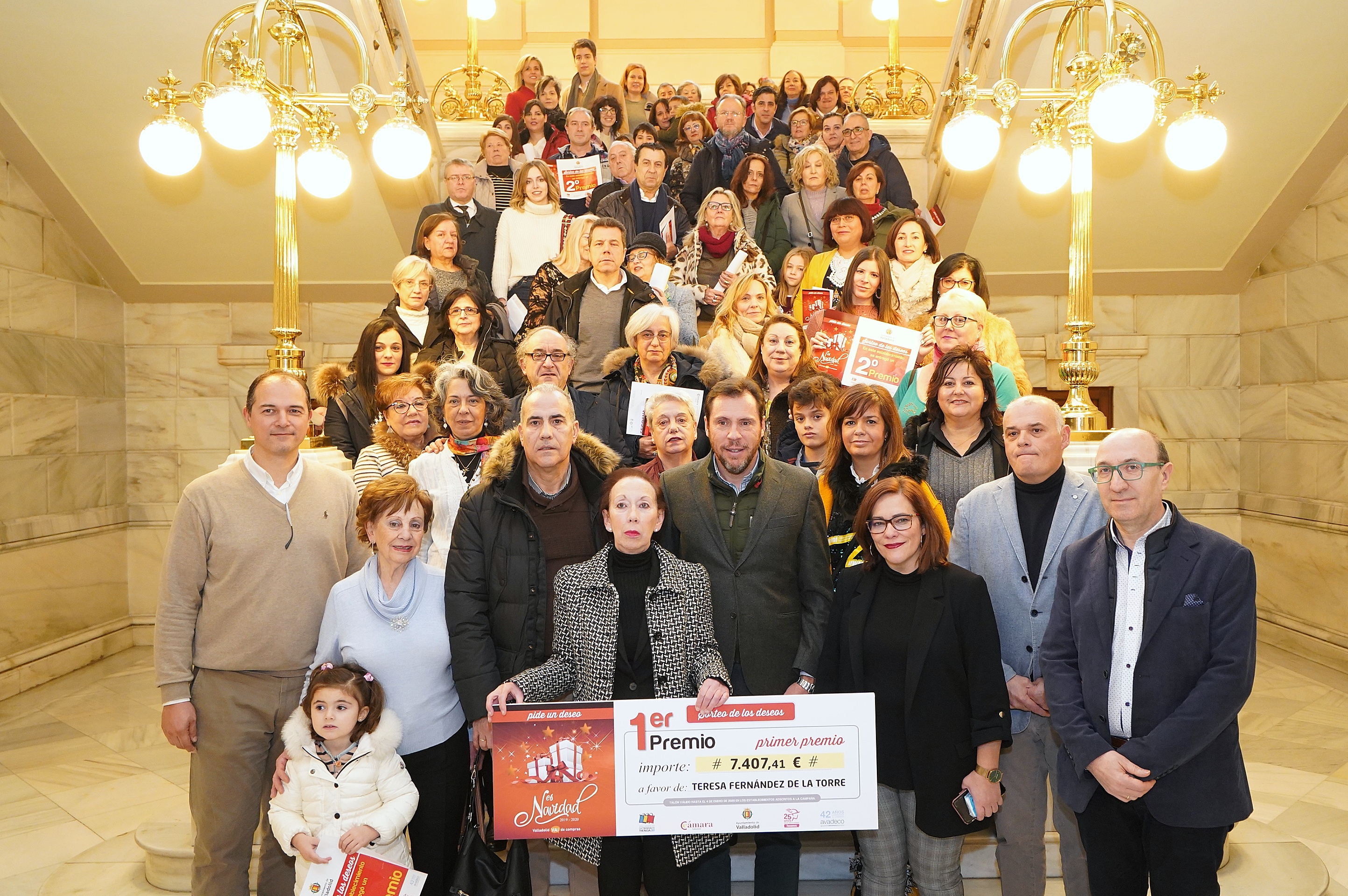 El alcalde, Óscar Puente, acompañado por la concejala de Innovación, Desarrollo Económico, Empleo y Comercio, Charo Chávez, el presidente de FECOSVA, Jesús Herreras, el presidente de AVADECO, Alejandro G. Pellitero, y el vicepresidente de la Cámara de Comercio de Valladolid, Javier Labarga, han hecho entrega en el Salón de Recepciones del Ayuntamiento, a quienes fueron agraciados, de los cheques regalo del Sorteo del Árbol de los Deseos.