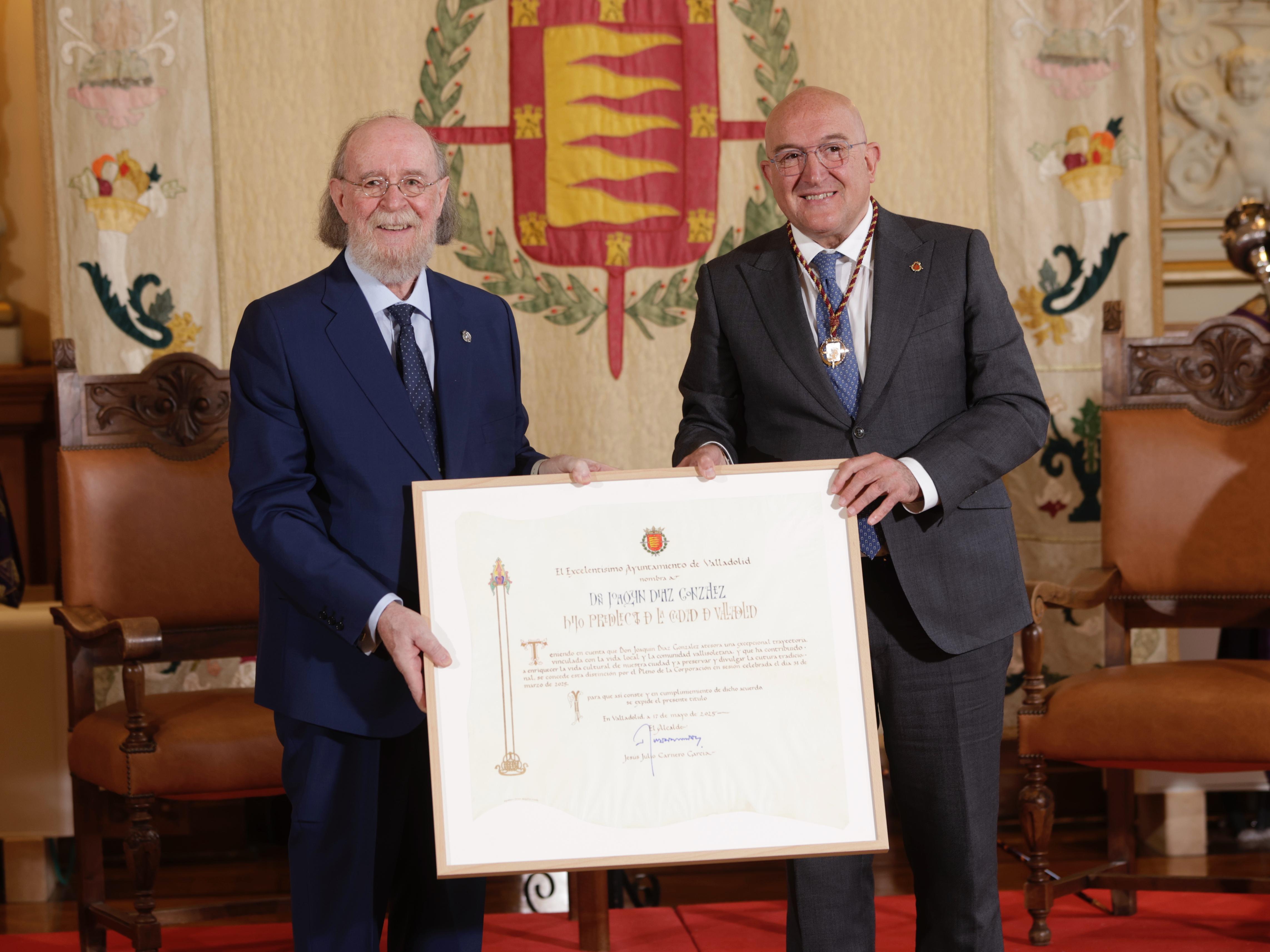 El Ayuntamiento de Valladolid ha rendido hoy un emotivo y solemne homenaje a Joaquín Díaz González, otorgándole la distinción de Hijo Predilecto de la Ciudad, en un acto celebrado en el Salón de Recepciones del Consistorio y presidido por el alcalde, Jesús Julio Carnero.