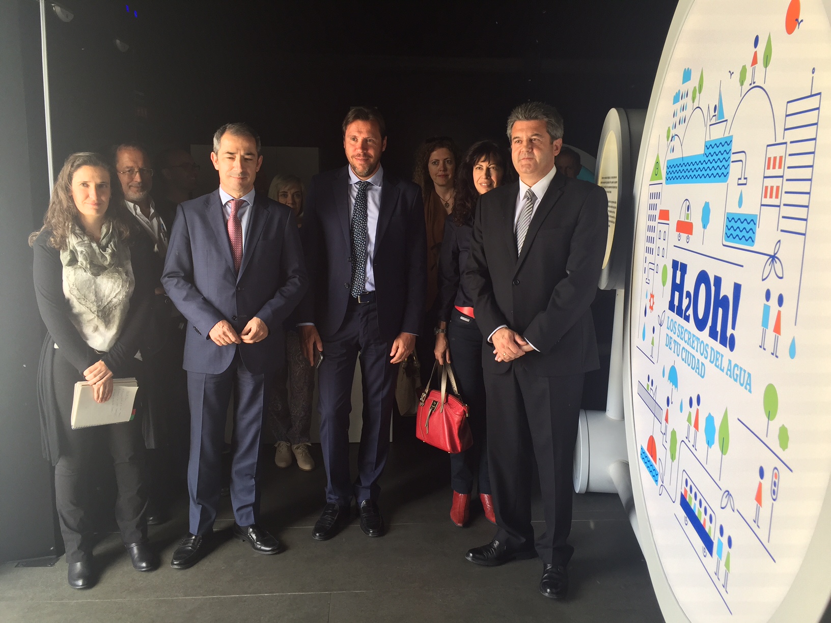 Oscar Puente, alcalde de Valladolid, José Manuel Bilbao, director Territorial de CaixaBank en Castilla y León-Asturias, e Ismael Olmedo, Director General de Aguas de Valladolid, presentaron este martes la nueva exposición ¡H2Oh! Los secretos del agua de tu ciudad.