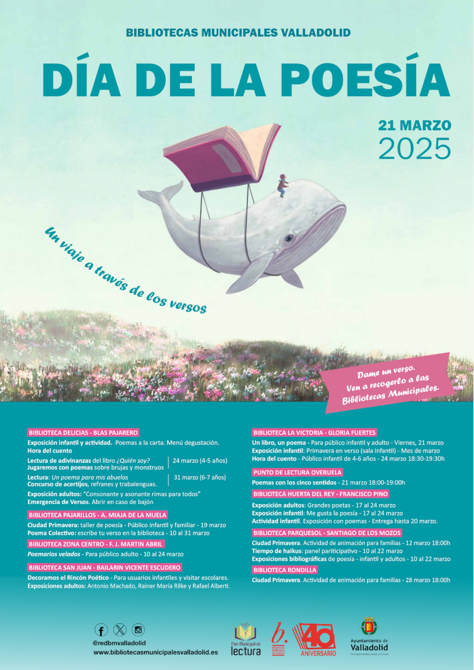 Desde la Concejalía de Educación y Cultura del Ayuntamiento de Valladolid, y a través de la Red de Bibliotecas Municipales, se han organizado más de 25 actividades entre exposiciones, concursos, hora del cuento, talleres de poesía, haikus y poemas colectivos. Unas actividades, que tienen su epicentro hoy en las bibliotecas y puntos de lectura municipales, pero que se vienen desarrollando desde el día 10 de marzo hasta finales de este mes.