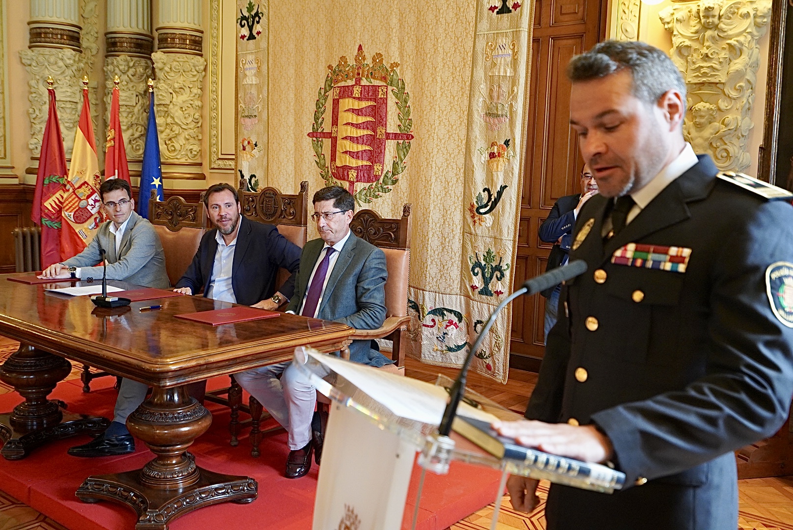 La edad de la media de los policías municipales en 2015 era de 50 años, hoy es de 33. Es un dato que evidencia la apuesta del Ayuntamiento de Valladolid en los últimos ocho años por la mejora de un servicio esencial. Hoy ha tomado posesión el nuevo intendente jefe de la Policía Municipal, Juan Manuel González Becerra . El alcalde en funciones, Óscar Puente, acompañado por el concejal en funciones de Planificación y Recursos, Pedro Herrero, y el secretario municipal, Jesús Mozo Amo, ha presidido el acto en el Salón de Recepciones, a donde han acudido, además de familiares y compañeros, el concejal de Salud Pública y Seguridad Ciudadana, Alberto Palomino, y el concejal de Recursos Humanos, Juan Carlos Hernández.