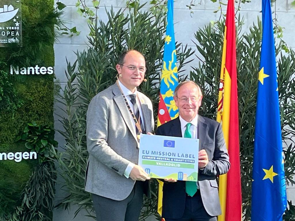 El concejal de Medio Ambiente del Ayuntamiento de Valladolid, Alejandro García Pellitero, ha recogido hoy en Valencia el Sello Misión de la Comisión Europea, que han conseguido 10 ciudades de la ‘Misión Europea 100 Ciudades Inteligentes y Climáticamente Neutras en 2030’, de manos del director General Adjunto de Medioambiente y responsable de la Misión Climática, Patrick Child.