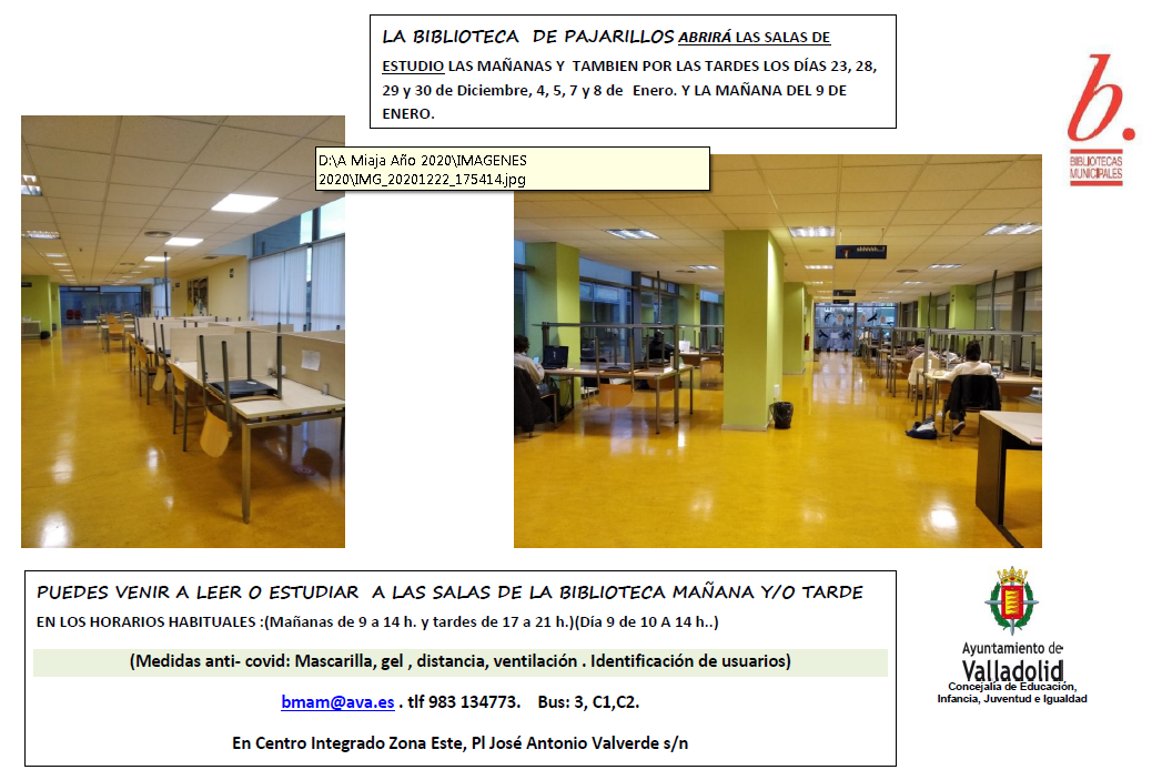 Puedes venir a leer o estudiar a la sala de la Biblioteca Adolfo Miaja de la Muela (Barrio de Pajarillos) en los horarios habituales de mañana y tarde (9h a 14h y 17h a 21h) salvo el día 9 de enero (10h a 14h).