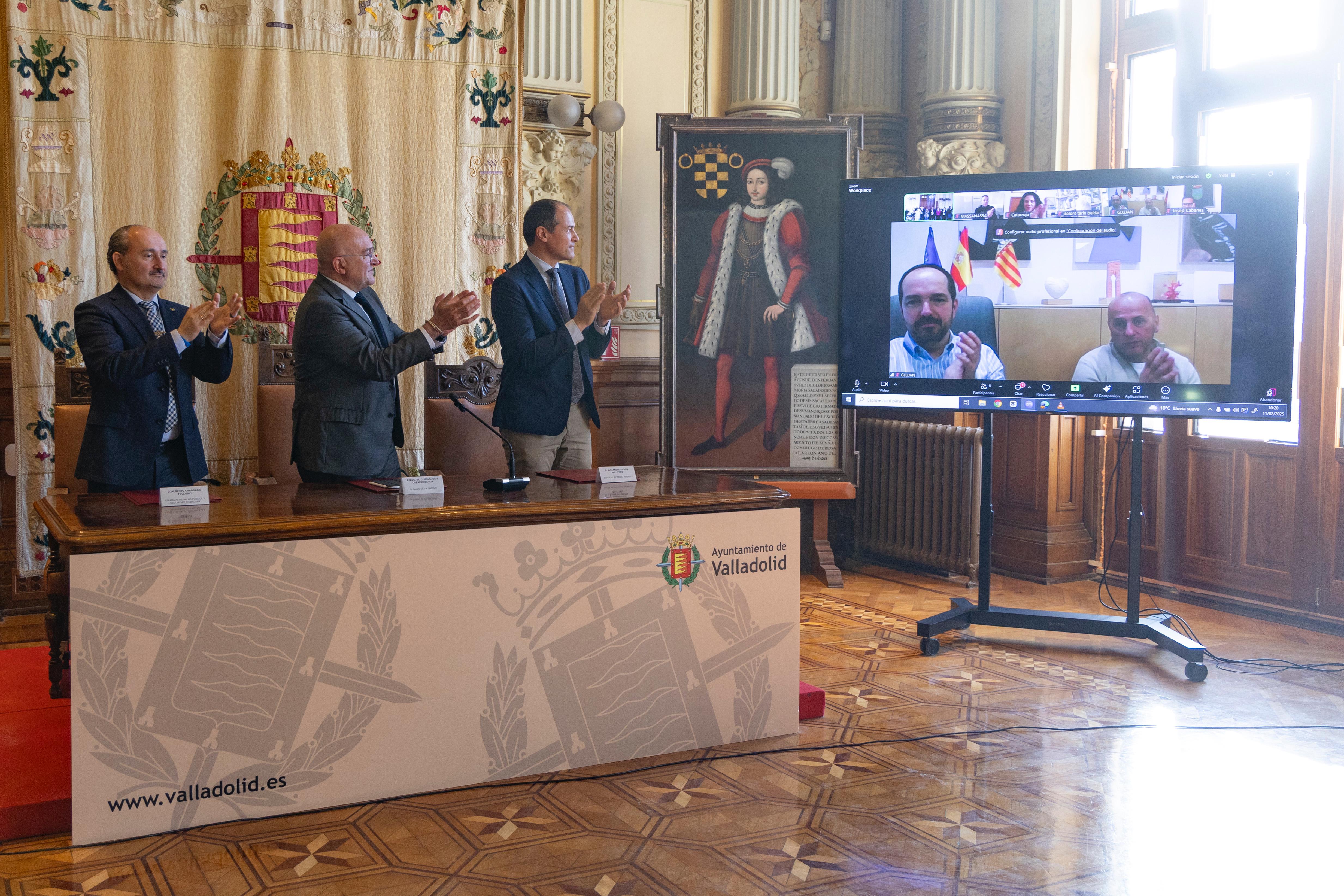 El acto, en el que el alcalde ha hecho entrega de una placa de reconocimiento a los representantes de los servicios homenajeados, ha contado con la presencia telemática de distintas autoridades políticas de los municipios afectados por la DANA en los que han actuado los servicios municipales del Ayuntamiento de Valladolid, como Albal, Aldaia, Alfafar, Benetússer, Catarroja, Massanassa, Paiporta y Sedaví.