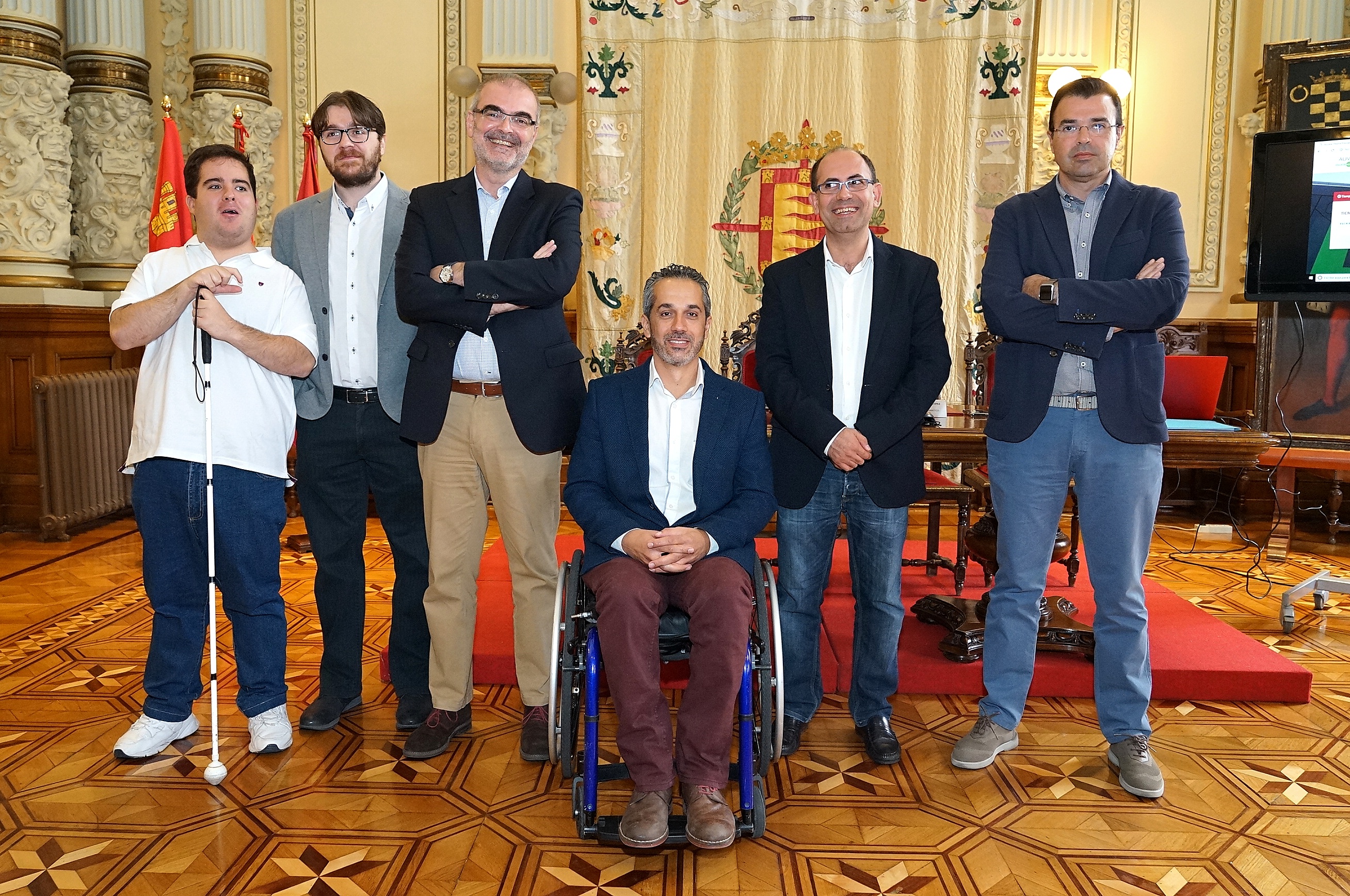 El concejal de Seguridad y Movilidad, Luis Vélez, junto al gerente de AUVASA, Andrés Bernabé; al ingeniero de AUVASA, Pedro Velasco, el representante de Javacoya, Javier Herrero; y el presidente de ASPAYM Castilla y León, Ángel de Propios, presentaron las nuevas versiones de web y APP de AUVASA 100 % accesibles.