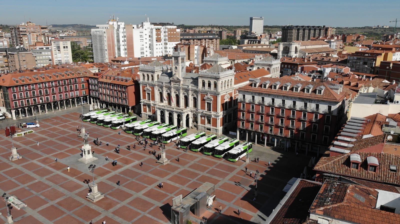 El alcalde de Valladolid, Oscar Puente, ha presentado los nuevos autobuses en la Plaza Mayor junto con el concejal de Movilidad y Espacio Urbano, Luis Vélez, y el gerente de AUVASA Álvaro Fernández. También han asistido representantes de SOLARIS, empresa adjudicataria del acuerdo marco de adquisición de autobuses propulsados por gas natural comprimido y suministrador de los autobuses SOLARIS URBINO 12 CNG.