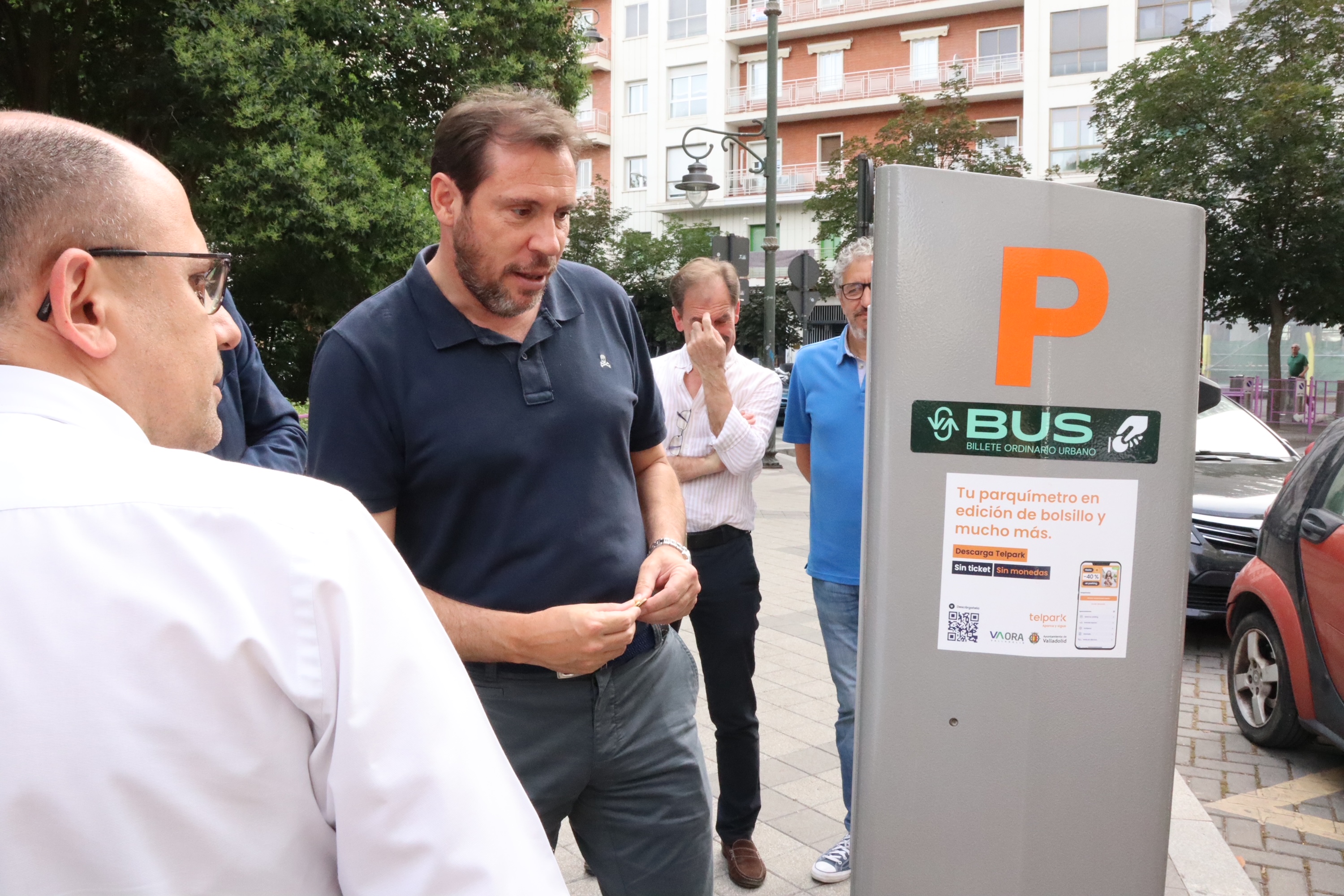 El alcalde de Valladolid, Oscar Puente, junto con el concejal de Movilidad y Espacio Urbano, Luis Vélez, probaron la venta del primer billete ordinario de AUVASA en el parquímetro de la ORA de Plaza Poniente. También participaron el gerente de AUVASA. Álvaro Fernández, el jefe del Centro de Movilidad, Roberto Riol, y el gerente de Dornier Empark, Teodoro Brioa.