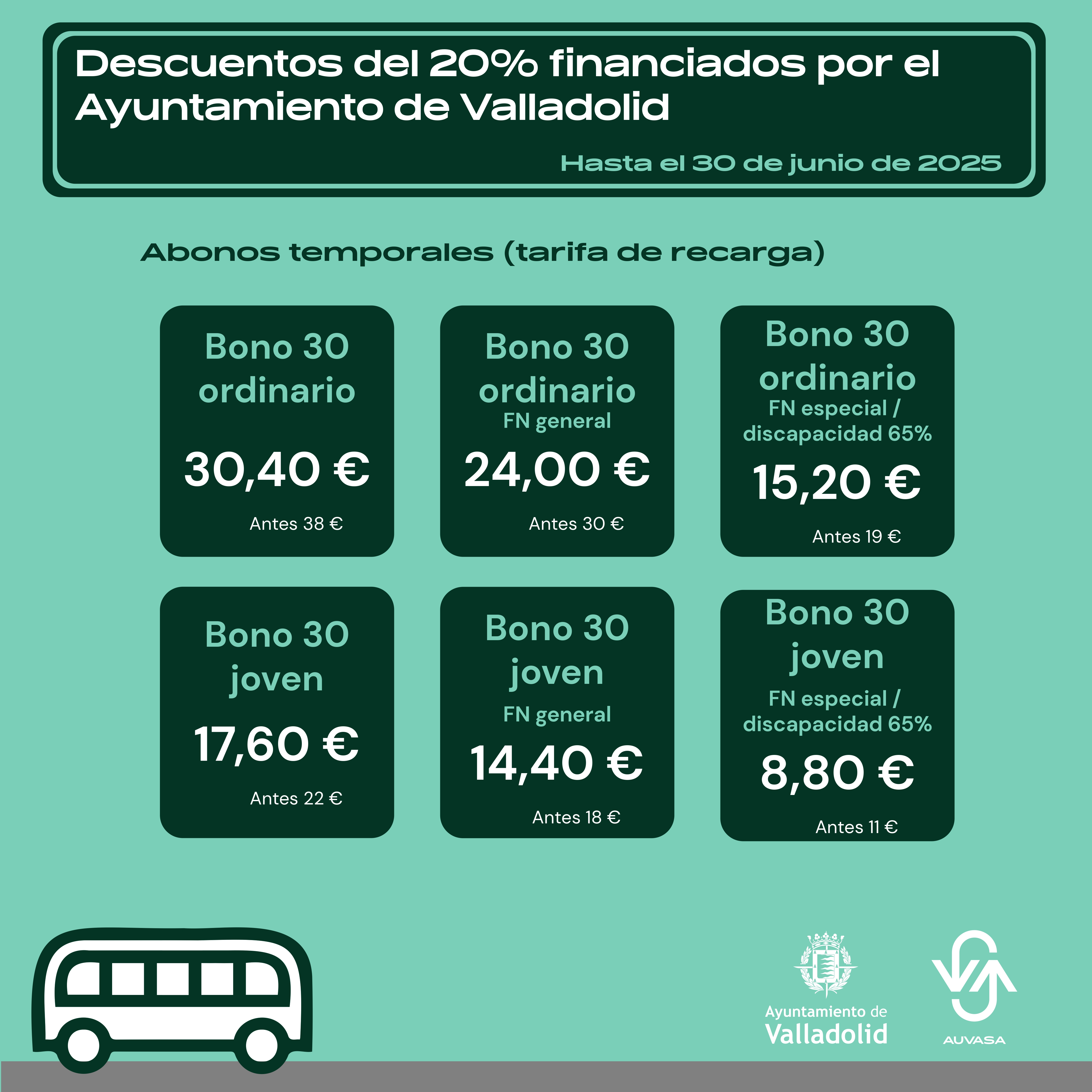 El Ayuntamiento de Valladolid, ha dado traslado a AUVASA del Acuerdo de la Junta de Gobierno Local para que aplique la nueva situación de las bonificaciones a partir de mañana 28 de enero, una vez conocida la eliminación de la aportación del Estado. En consecuencia, se continuará con la bonificación del Ayuntamiento de Valladolid del 20%, como venía haciendo desde el 1 de enero de este año.