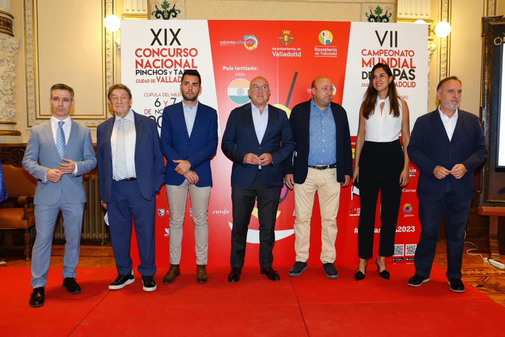 El alcalde, Jesús Julio Carnero, ha presentado hoy la XIX edición del Concurso Nacional de Pinchos y Tapas y el VII Campeonato Mundial de Tapas Ciudad de Valladolid que organiza el Ayuntamiento de Valladolid a través de la Sociedad Mixta de Turismo, junto a los directores técnicos de ambos concursos, Luis Cepeda y Ángel Moretón, respectivamente, y el presidente de la Asociación de Hostelería de Valladolid, Jaime Fernández.