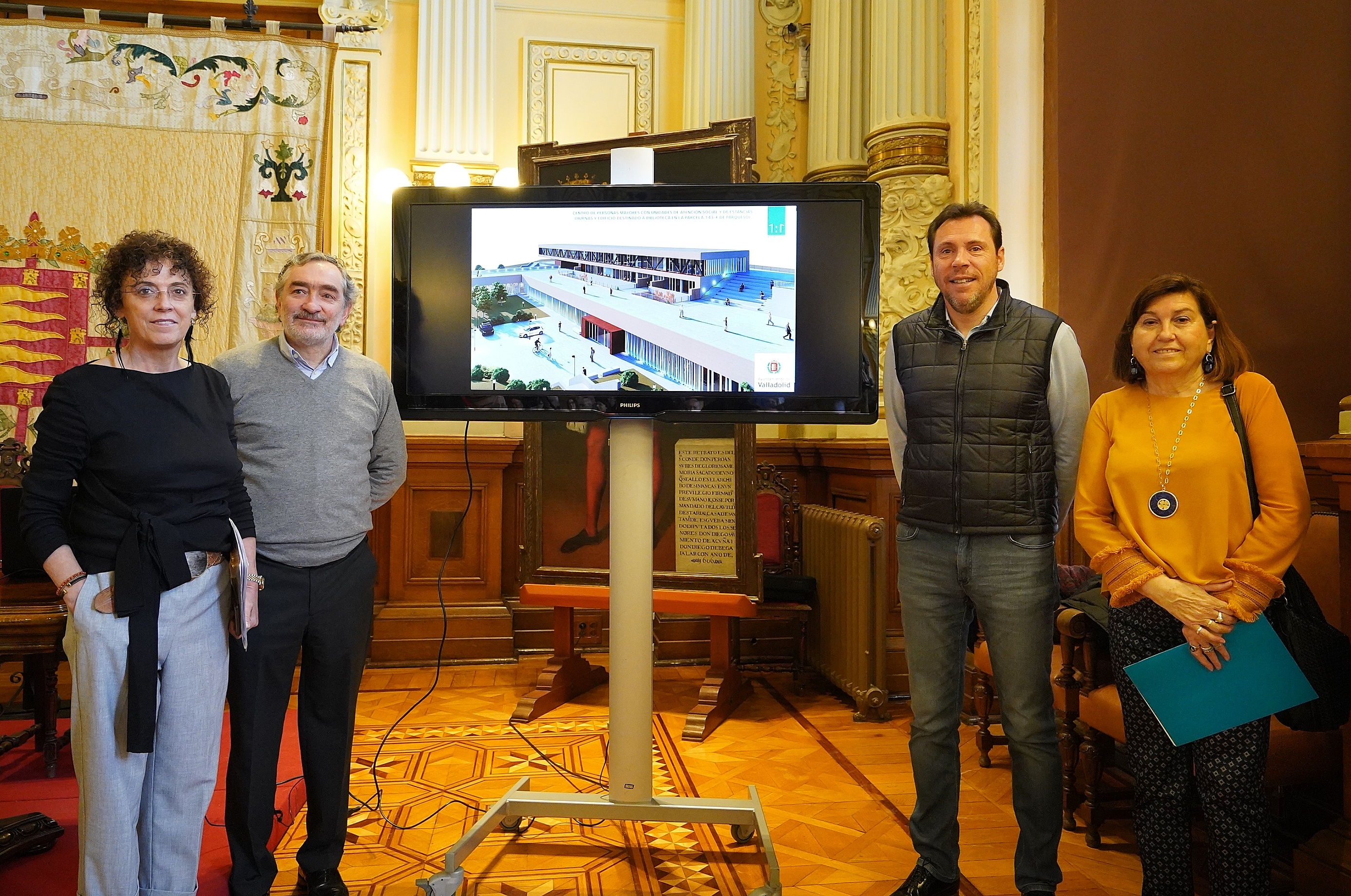 El alcalde, Óscar Puente, acompañado por la concejala de Servicios Sociales, Rafaela Romero, y la concejala de Educación, Infancia, Juventud e Igualdad, María Victoria Soto, ha presentado el proyecto del edificio que albergará el nuevo Centro de Personas Mayores y la nueva Biblioteca Municipal que se ubicarán en el barrio de Parquesol.