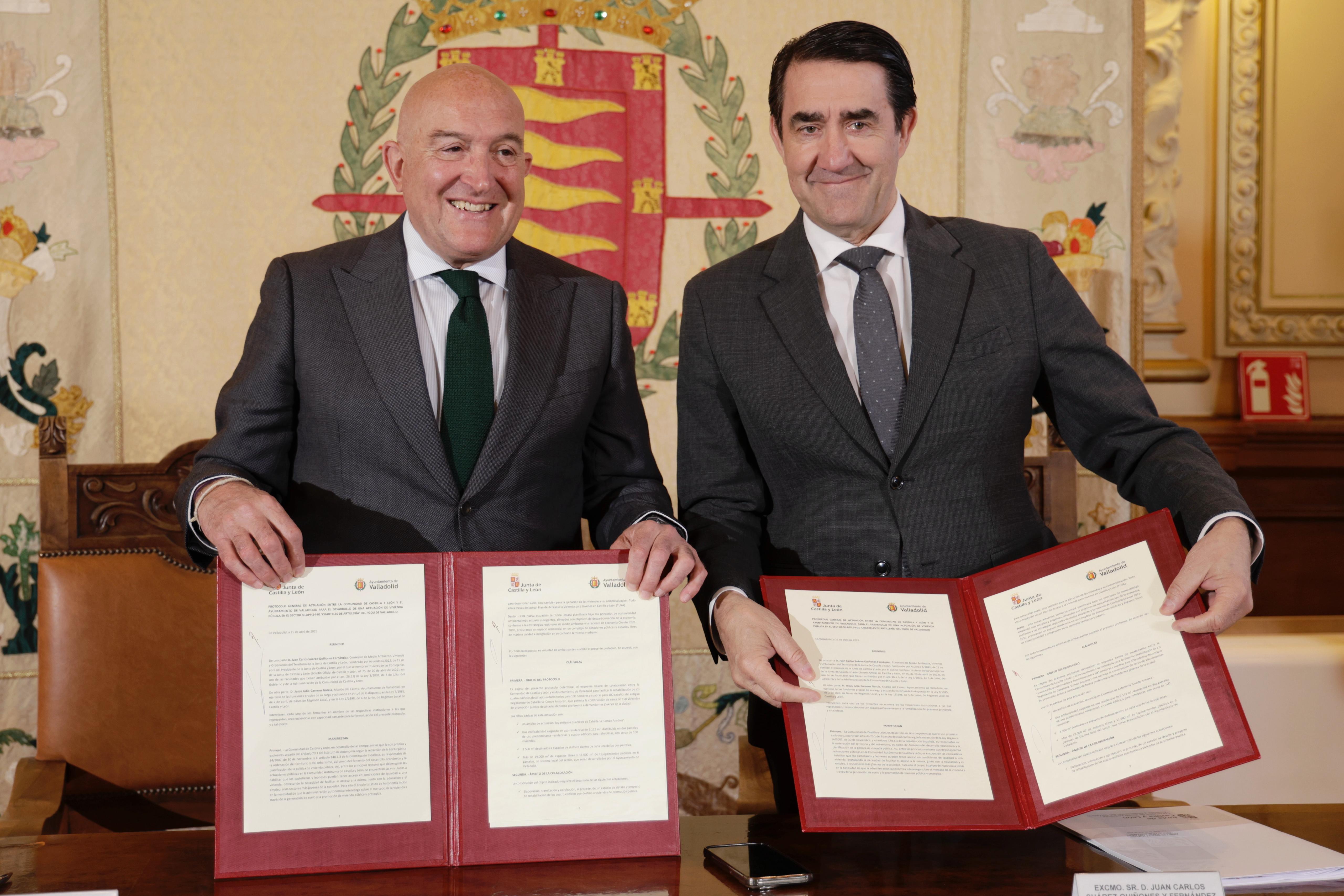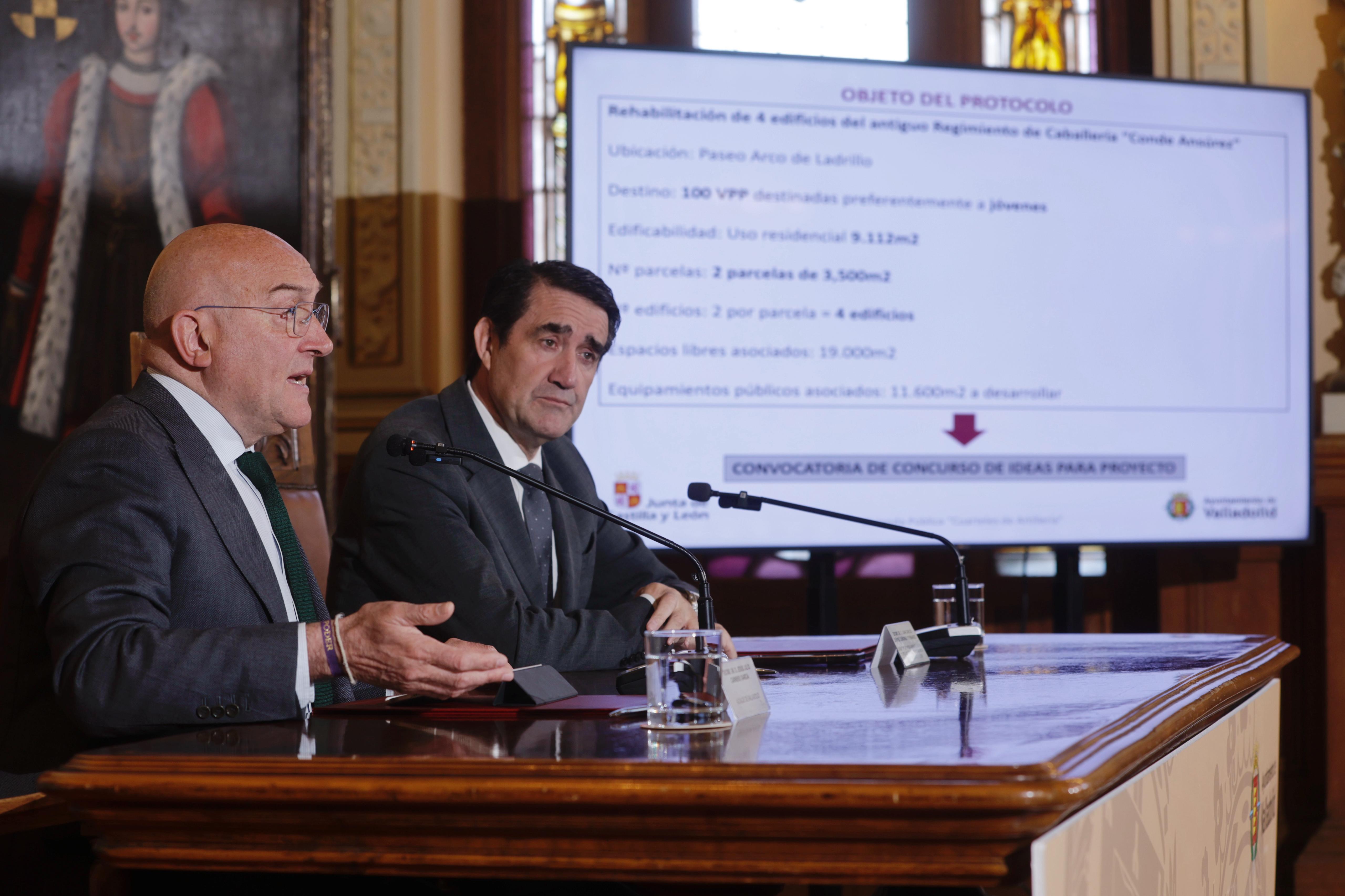 El alcalde de Valladolid, Jesús Julio Carnero, junto al consejero de Medio Ambiente, Vivienda y Ordenación del Territorio de la Junta de Castilla y León, Juan Carlos Suárez-Quiñones, han presentado esta mañana el nuevo proyecto de viviendas públicas en el sector SE.APP.54-01 ‘Cuarteles de Artillería’, una actuación conjunta que supone un importante paso adelante en el acceso a la vivienda para la población joven de la ciudad.