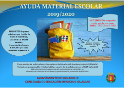 Con fecha de hoy, 30 de mayo, se ha publicado en el BOP la convocatoria de ayuda de material escolar para el curso 2019-2020. El plazo de presentación de solicitudes es de 15 hábiles, debiendo presentarlas en Registro a partir de mañana, día 31 de mayo, hasta el próximo día 20 de junio.
