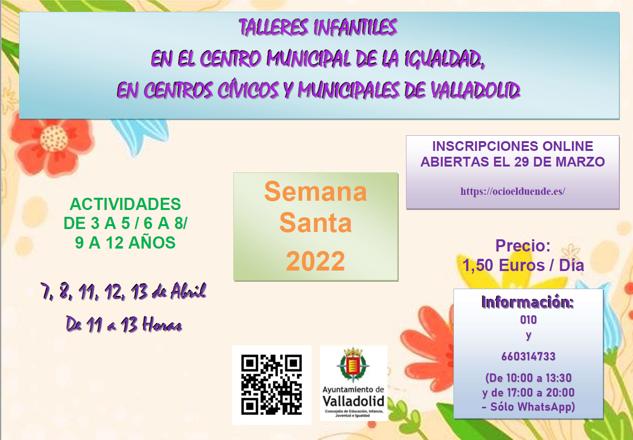 La Concejalía de Educación, Infancia, Juventud e Igualdad pone en marcha para Semana Santa la oferta de talleres en los Centros Cívicos y Municipales y en el Centro Municipal de la Igualdad de Valladolid para ayudar a conciliar la vida familiar y laboral y ofrecer a los niños y niñas de este municipio actividades lúdicas y educativas.