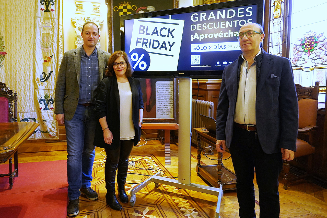La concejala de Innovación, Desarrollo Económico, Empleo y Comercio, Charo Cha´vez, ha presentado esta mañana la campaña "Black Friday", junto al presidente de AVADECO, Alejandro García Pellitero, y al presidente de FECOSVA, Jesús Herreras.