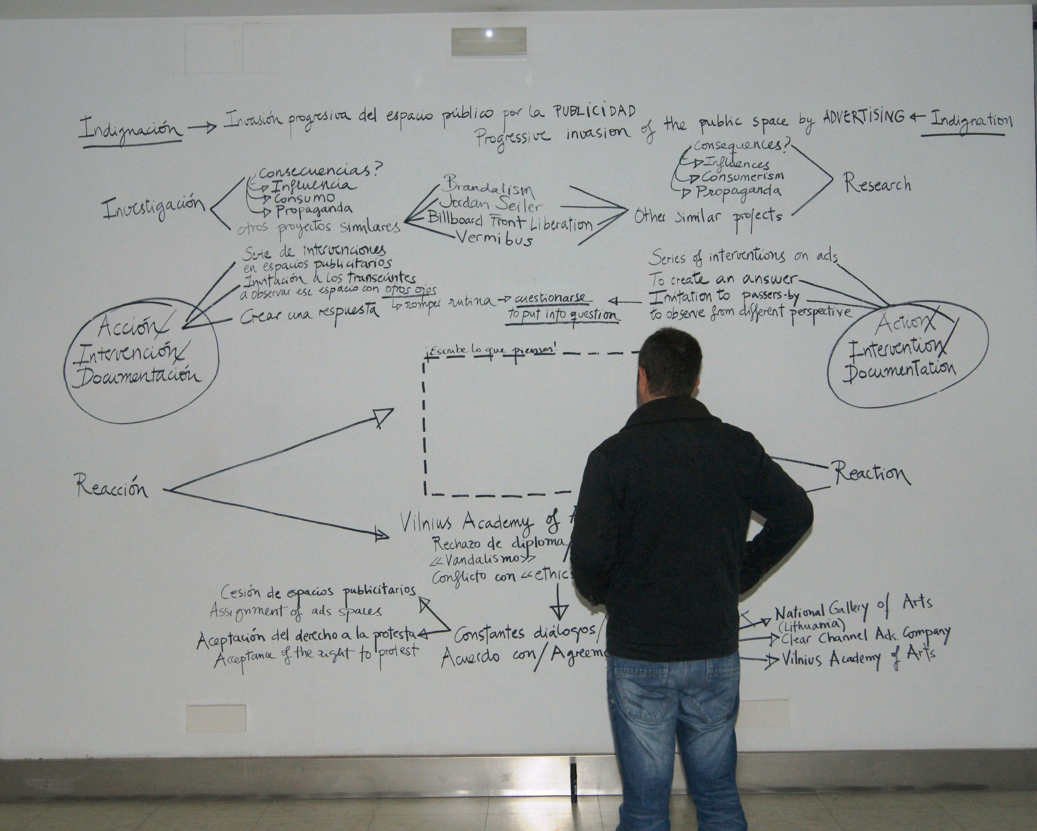 El contexto del desarrollo del proyecto es casi tan importante como su concepto original, por constituir un diálogo interesantísimo con el espectador y, a su vez, la institución que acogía el proyecto. El espacio urbano en el que se llevan a cabo las intervenciones es la capital lituana de Vilnius y fueron presentadas a la Vilnius Academy of Arts como proyecto de Máster en Bellas Artes. Un choque cultural y generacional con la institución se puso de manifiesto, al tiempo que recibía apoyo de compañeros de curso y artistas externos. La controversia estuvo servida hasta la exposición final en el centro Jonas Mekas de Vilnius bajo la amenaza de la retirada del Diploma. Finalmente el resultado fue un sobresaliente que simbolizaba la aceptación de la crítica a las instituciones y de la emancipación del artista.
